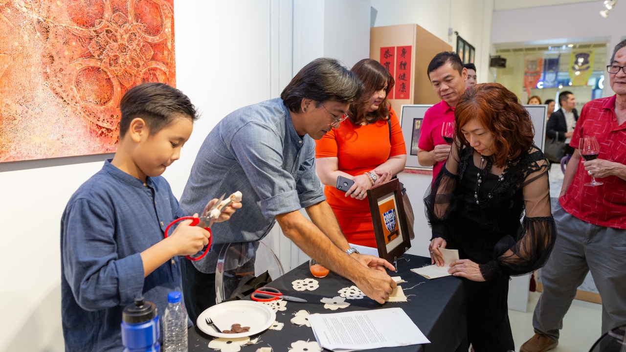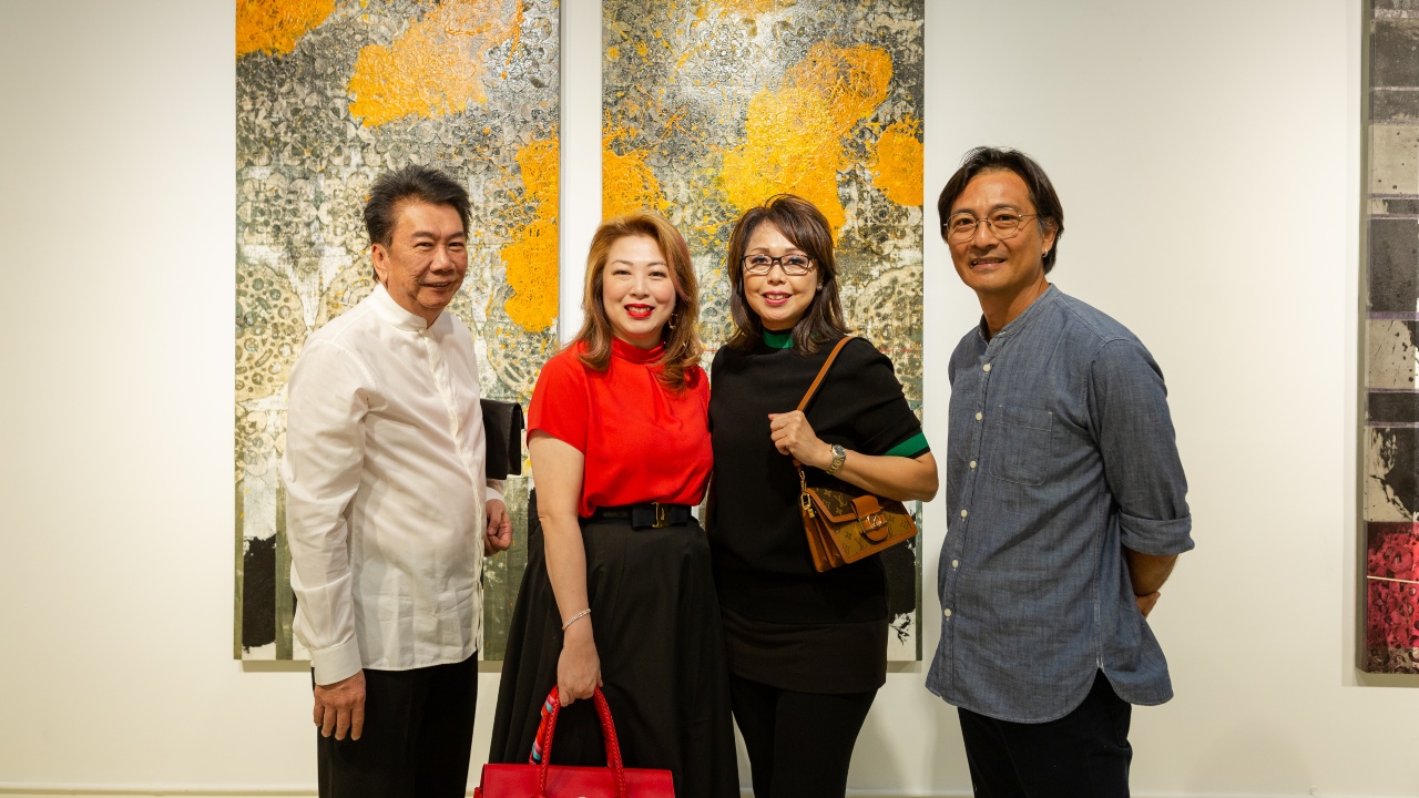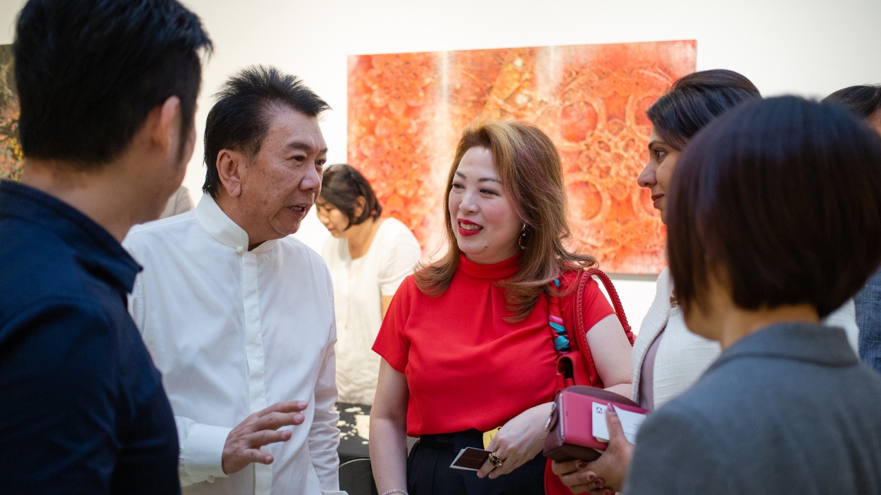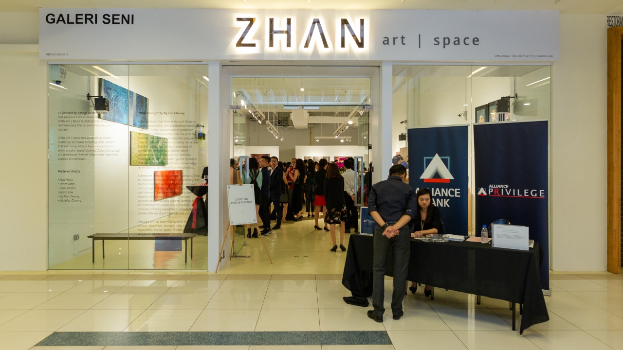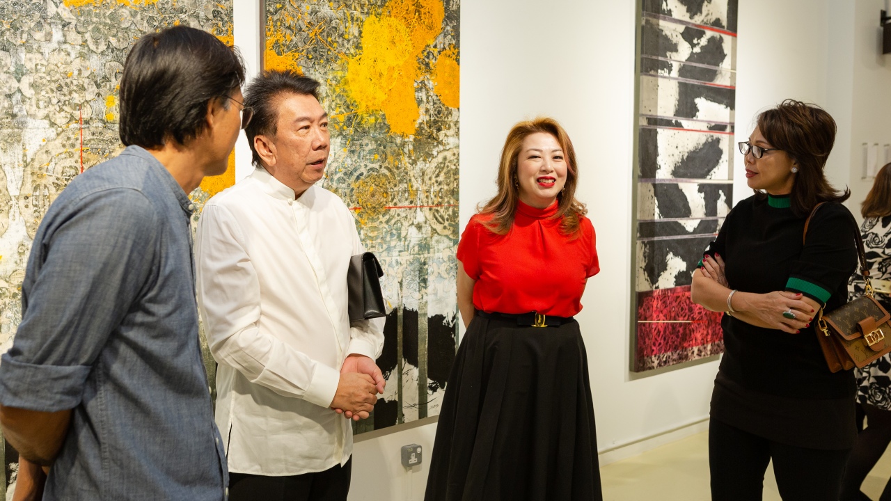 With a table of cold cuts and cheeses on the side and French wine flowing, Alliance Bank’s by-invitation exhibition was hitting all the right cultural notes. Held at Zhan Art Space, a gallery in Jaya One, the star of the show was the work of local veteran artist Ng Foo Cheong. Ng’s mixed media pieces fuse the traditional and contemporary, laying powerful, abstract colours over raised symbols inspired by his childhood memories of paper-cutting.