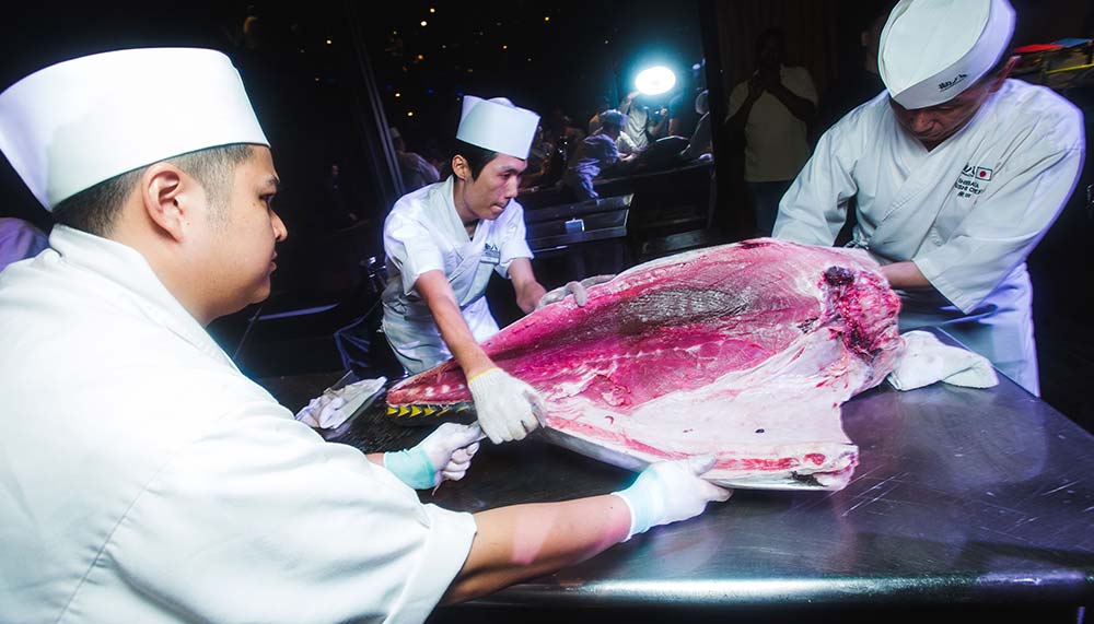 Those who showed up that evening were welcomed by a bevy of models who ushered them onto a paparazzi-populated red carpet. Inside the main room, guests were regaled by an ambience of contemporary and retro music. For food, the highlight included a giant 73kg bluefin tuna flown in fresh from Fukuoka, expertly sliced by masterful Japanese chefs into tender chunks of sashimi and paired with seasonal chilled sake.