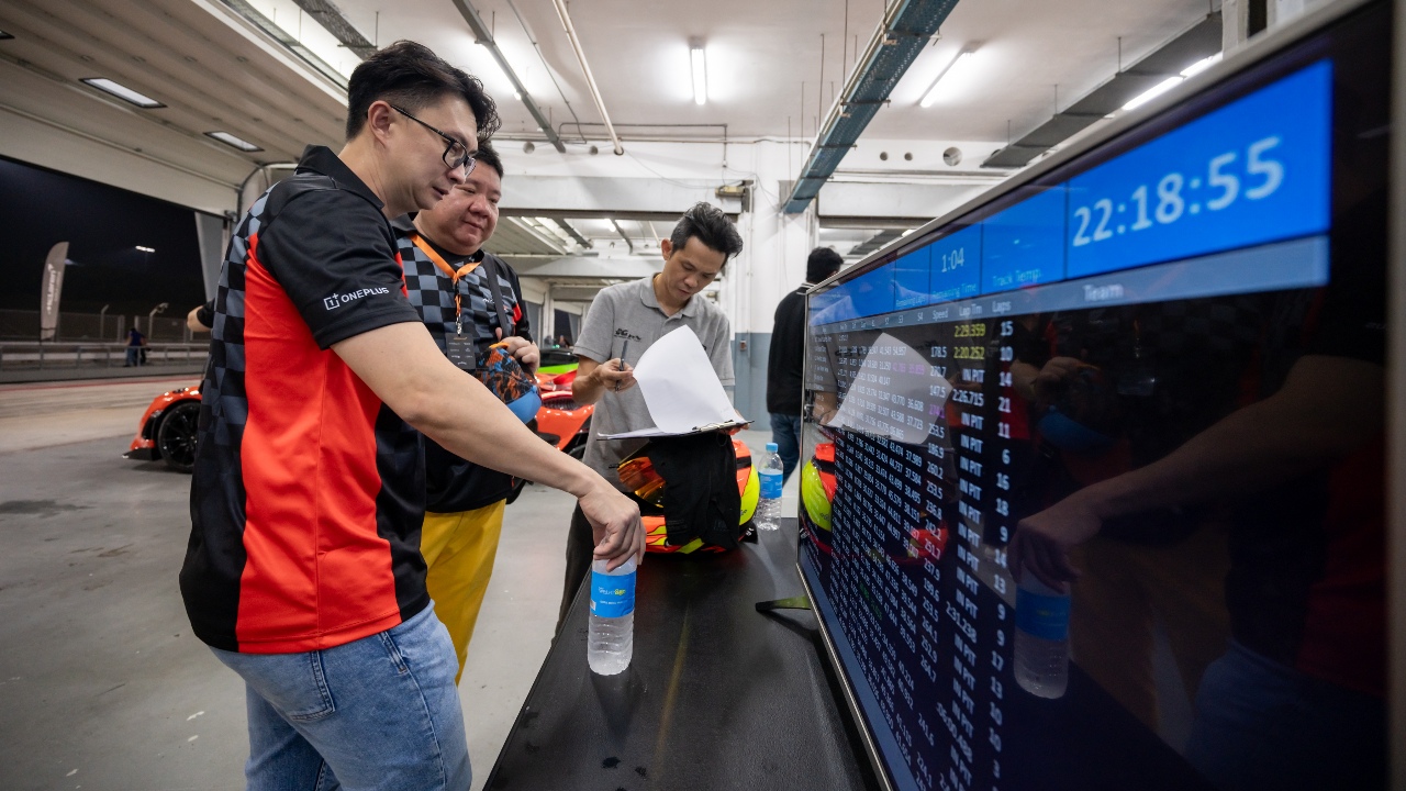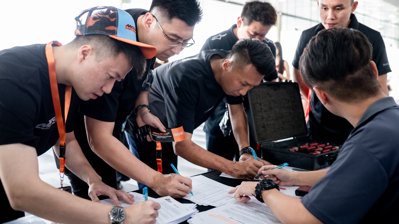 Leading up to the race, eager drivers flocked to the paddock in the early evening for registration. A dedicated counter at the entrance allowed participants to scan a QR code for a chance to enter a lucky draw and win exclusive prices. These included hotel stays, coupons and membership programmes by Hilton Kuala Lumpur, travel essentials from the Tumi McLaren Collection, bottles of Champagne Carbon and Jack Daniel’s, and OnePlus 12R mobile phones. MOCM members were issued with their own team attire and a Technogym wellness pass, while non-members were given caps and tags.