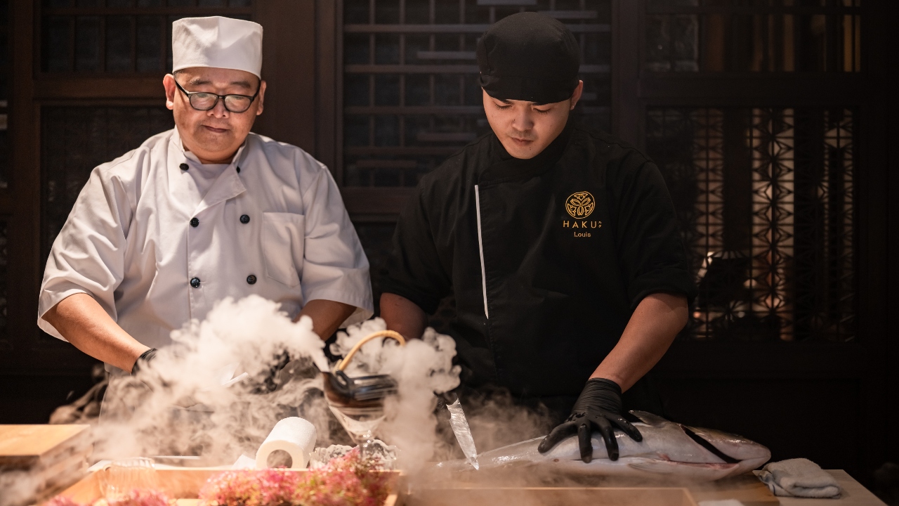 The opening salvo of an opulent 22-course omakase menu began with Frosista caviar with condiments, as well as five variants of caviar on offer, originating from sturgeon species such as Baeriii, Kaluga, Osetra and Amur. This was followed by a Miyagi oyster trio, scallop slices and uni. The slicing of a whole burihira—a cross breed of buri (yellowtail) and hiramasa (yellowtail amberjack)—soon took centre stage. The result of this hybridisation combines the umami of the buri and the beautiful firm texture of the hiramasa, with Haku’s chefs expertly slicing choice cuts before smoking it with cherry wood.