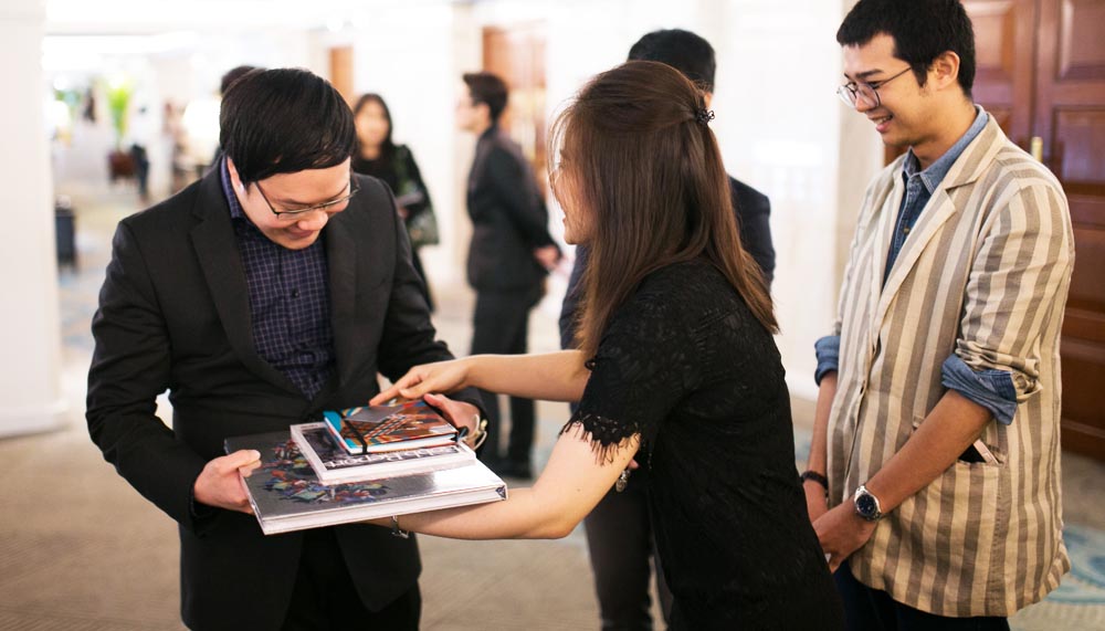 Nuntakorn Chang, Public Relations & Marketing Manager of Vie Hotel receiving a set of magazines and a coffeetable book
