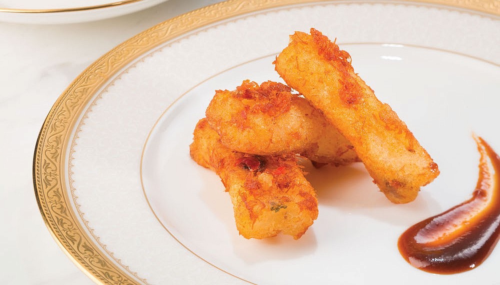 That, in essence, means letting the ingredients sing without drowning them in a wave of techniques and contrasts. This is evident in the first dish placed before me – a trio of the restaurant’s specialties. The fried diced cod fish is beautifully fresh, its natural sweetness enhanced by a honey syrup. The steamed shrimp, scallop and pork dumpling is a delicious dim sum derivation (topped with gold leaf for good measure), while the pan-fried rice flour rolls retain their crispiness for a surprisingly long time, unleashing its inner warmth and springy texture with every bite.