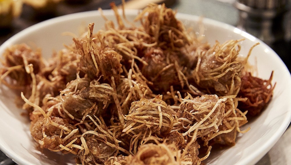 Diners cooled off with glasses of blue butterfly pea tea and bael fruit juice before proceeding to the dessert selection, which featured many of Thailand’s most famous desserts – the main attraction being an enormous cart of mangos and sticky rice. (Those who really couldn’t take the heat were relieved to discover another cart with freshly opened coconuts on standby.) Tub tim grob, often referred to as water chestnut rubies in sweetened coconut milk, proved equally popular, while baked mung bean custard topped with fried shallots and banana fritters with soft custard drew those with an enquiring sweet tooth.