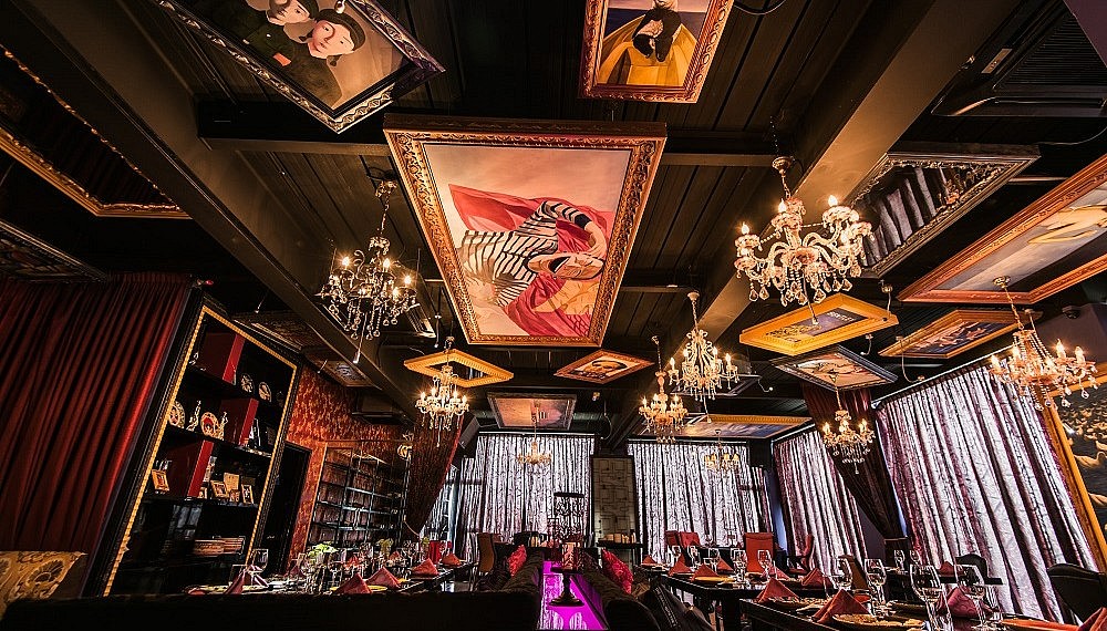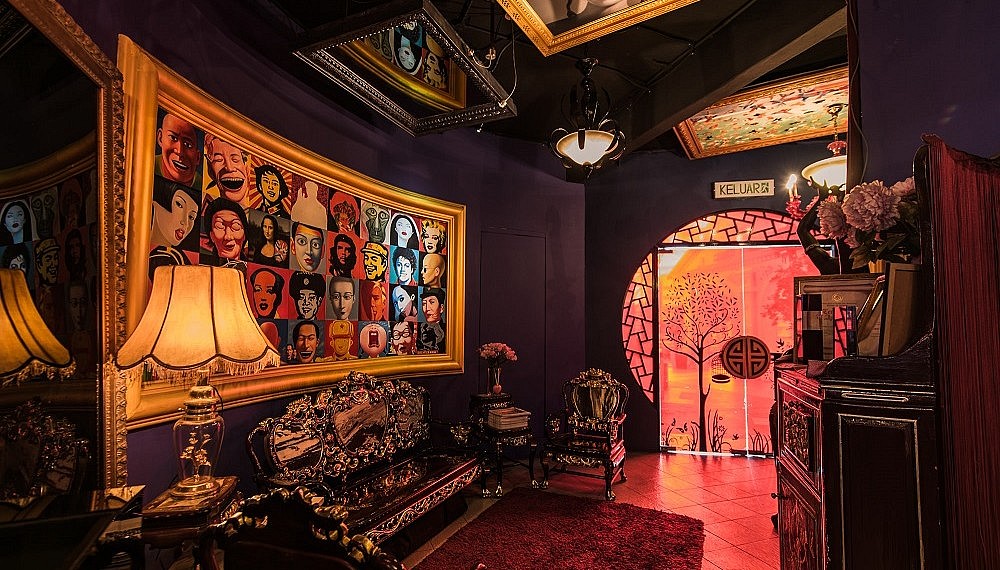 First impressions can many times be summed up in a single word. In the case of Chin’s Stylish Chinese Cuisine – jutting out over the waters of Penang’s Weld Quay at the end of a pier like the historic residential jetties a few paces away – that word is eclectic. A moon gate door of ruby glass leads into a setting that aspires to opulence, a very specific kind of opulence. Mother-of-pearl inlaid rosewood furniture, the sort that belongs in a museum, sits under a collage of portraits rendered in Andy Warhol Pop Art colours or Yue Minjun’s pastel grins. A Grecian goddess functions as a lamp, placed under traditional red Chinese lanterns. In the dining room – which seats up to 90 – gold-framed paintings from Chinese artists are suspended horizontally from the ceiling, some pierced with cables that power crystalline chandeliers. Plush cushions and brocade fabrics cover the chairs. On the tables are bespoke plates, painted with a bewildering variety of images from grazing zebras and Qing dynasty dragon robes to a Tamara de Lempicka painting. It feels less like stepping into a restaurant and more like entering the private chambers of a globe-trotting, art-collecting cognoscente.