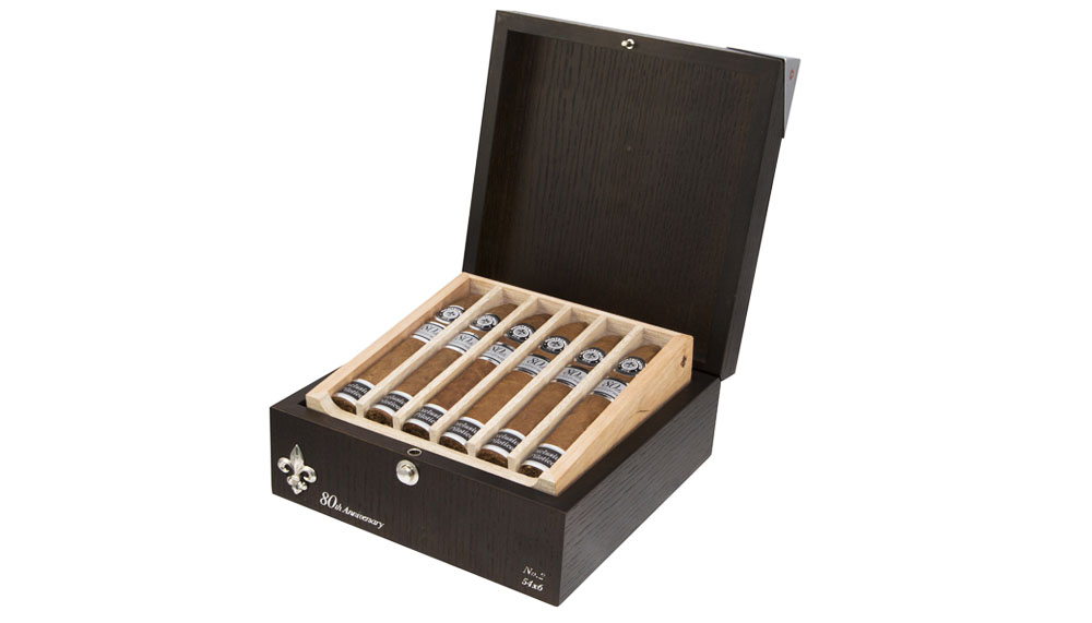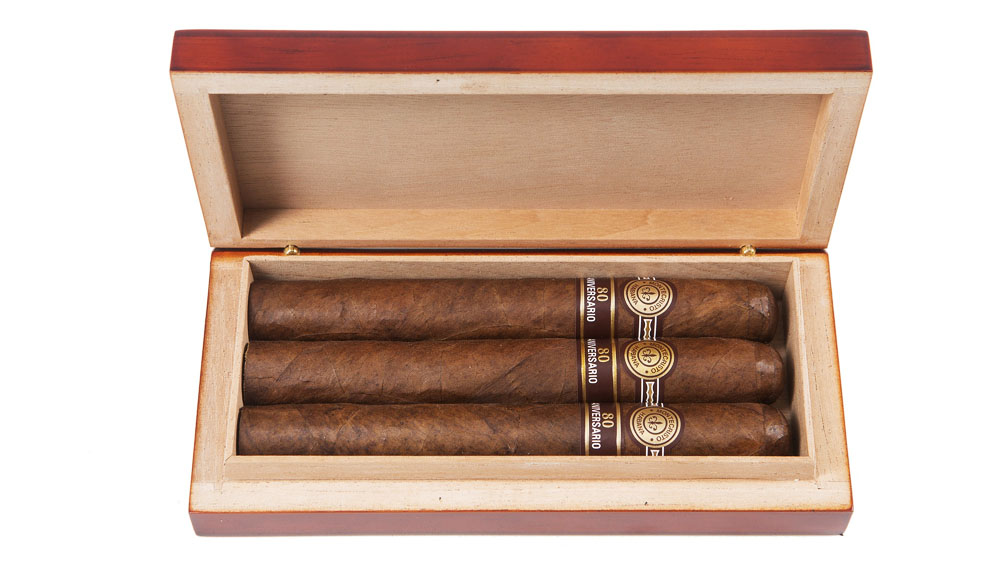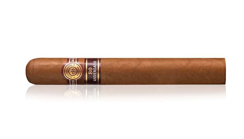 The Habanos Cuban Montecristo 80th Aniversario is a 6½ × 55 double robusto made entirely of Cuban Vuelta Abajo tobacco, with a fuller flavor than a traditional Montecristo. The cigar is available in boxes of 20, of which only 30,000 will be produced.