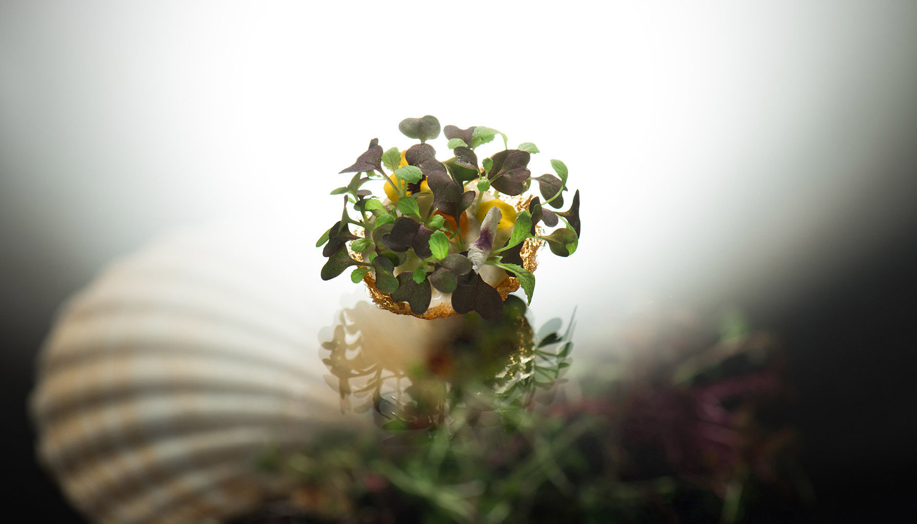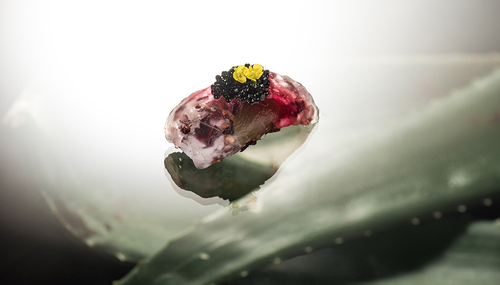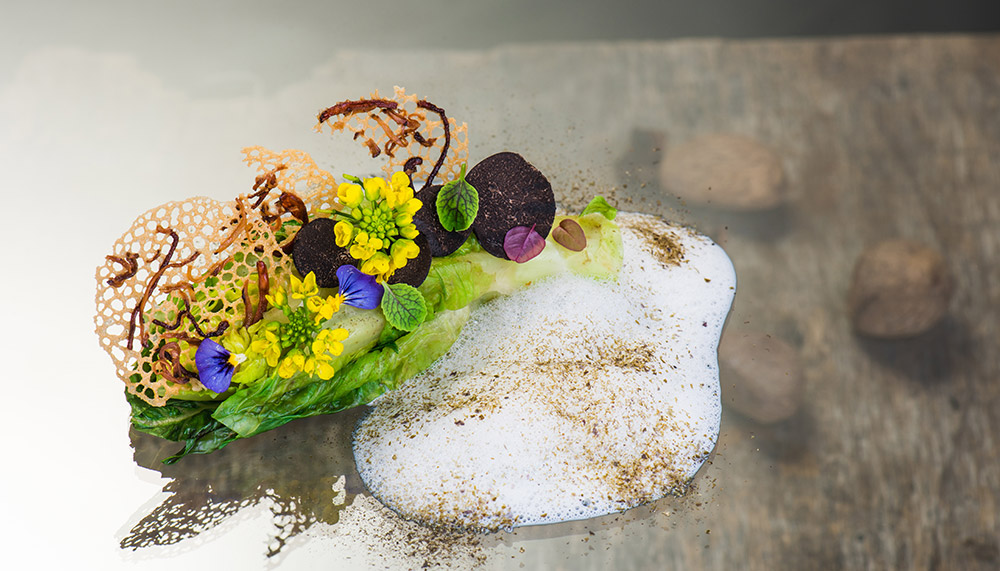 The Terroir of Malaysia, so named for showcasing a selection of fine local produce, features heart of gem lettuce, toasted seaweed, cordyceps mushroom straw, buah keluak and truffle crème fraiche, cress, blossoms, and an oyster and charred chicken glace. The unique taste of keluak, an underappreciated gem, gives the dish hints of boldness (similar to black garlic) to contrast the lighter greens featured.