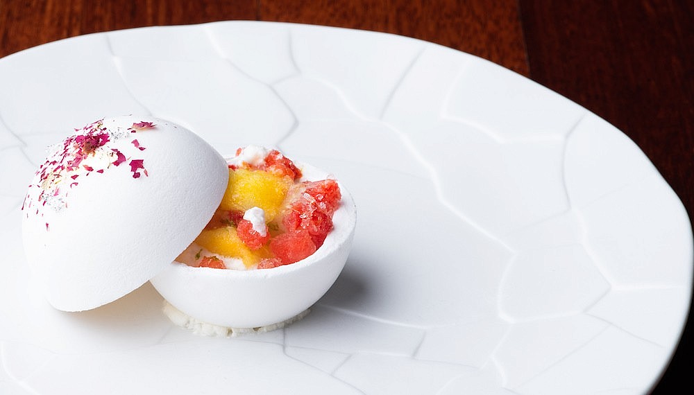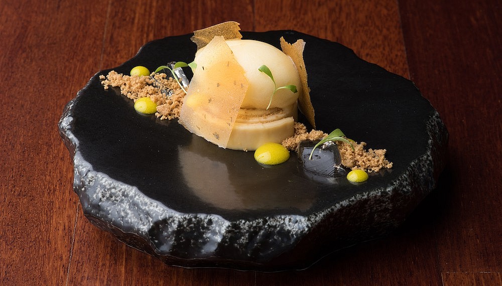 The community aspect of the restaurant could well be from the style of dining where diners eat on a long bar which sits 24 people comfortably facing the open kitchen. The chefs at work have been hand-picked from Penang’s finest young culinary talents. Tan explains that Gēn kitchen lacks the usual hierarchal structure and each chef prepares a dish from start to finish, in order to give them a sense of ownership. This approach is particularly effective as each dish is obviously the result of careful thought and impressive imagination which can only be realised by impeccable technique. This approach is realised in the nuanced flavours of slow-cooked black chicken on a bed of black rice – with a monochrome avant garde appearance which belies its homey taste of childhood. Then, there is the sensorial pleasure of cracking the delicate lime meringue shell encasing a luscious filling of piped soursop mousse, jackfruit sorbet and compressed frozen watermelon. If this is the future of fine dining in Penang, it is in good hands.