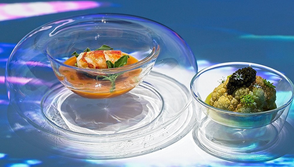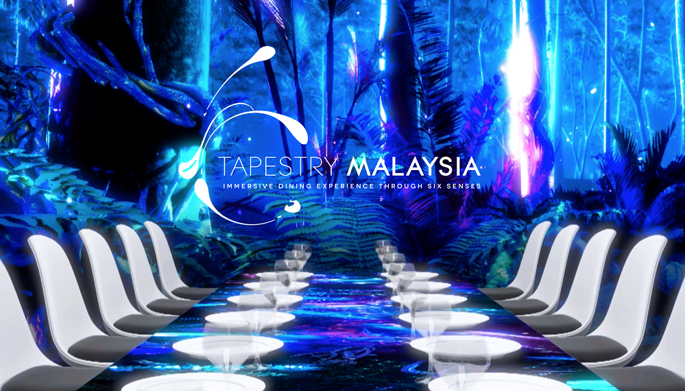 Various scenes make full use of Tapestry Malaysia’s multi-sensory, motion-sensitive technology, coupled with 360-degree projection. A lobster bisque with ice plant leaves and an anemone of burnt cauliflower is eaten underwater as fish glide past, after which diners are spirited away to the hustle and bustle of Malacca’s Jonker Street for their main course. The crowning moment of the meal is the coconut Bombe Alaska with a ferociously aromatic durian parfait glace, which arrives at the table aflame against the backdrop of a nighttime jungle setting, complete with glowing digital fireflies.