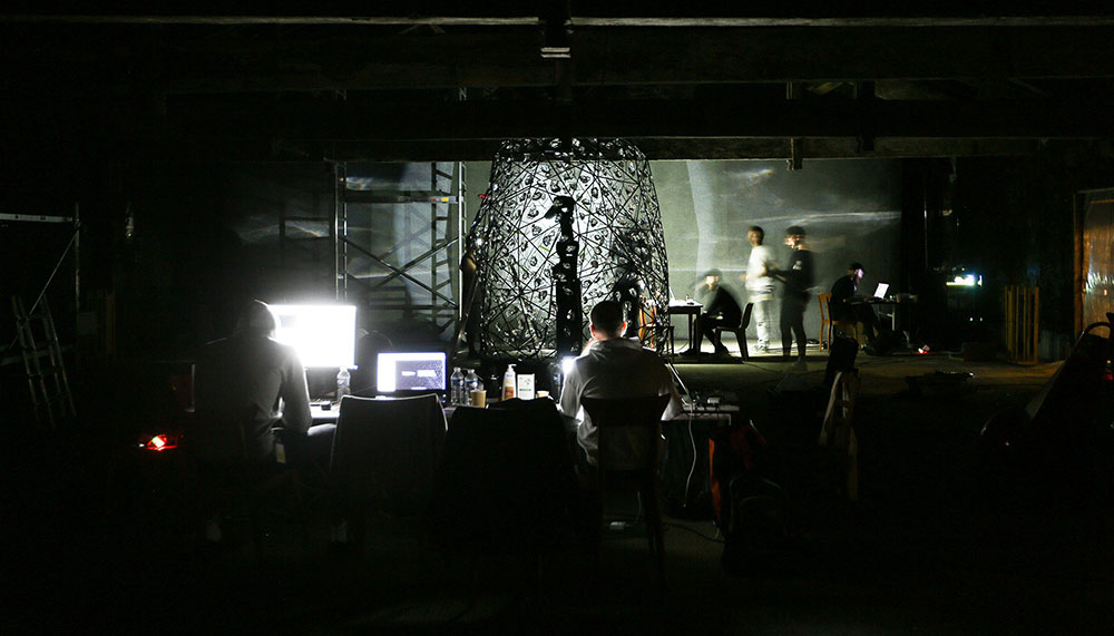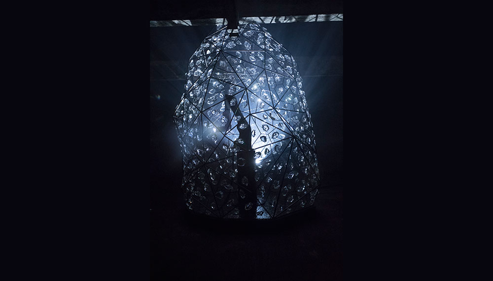 It’s dark. Only a dim glow illuminates the motes floating in the air, making me acutely aware of the damp, subterranean chill on my skin, the ancient, musty note in the air, and above all, the pervading silence. Suddenly, the gloom is pierced by a ray of light projected from an electronic arm that slowly swivels and pivots within a large cage of wire and sparkling crystals. Disconcertingly human in its movements, it swings in a wild frenzy one moment and pauses thoughtfully the next, directing its blinding gaze at one crystal shard, then another.