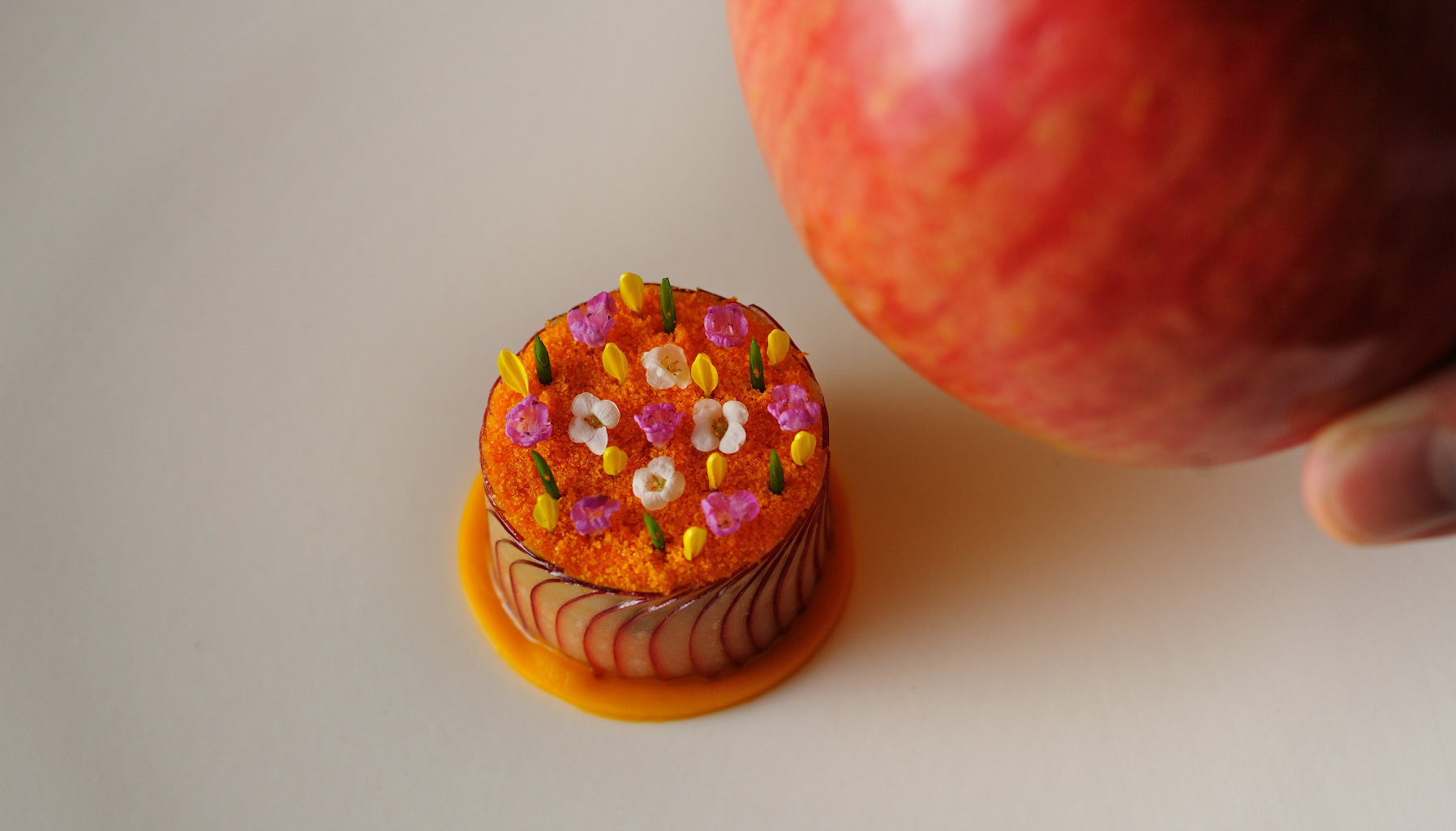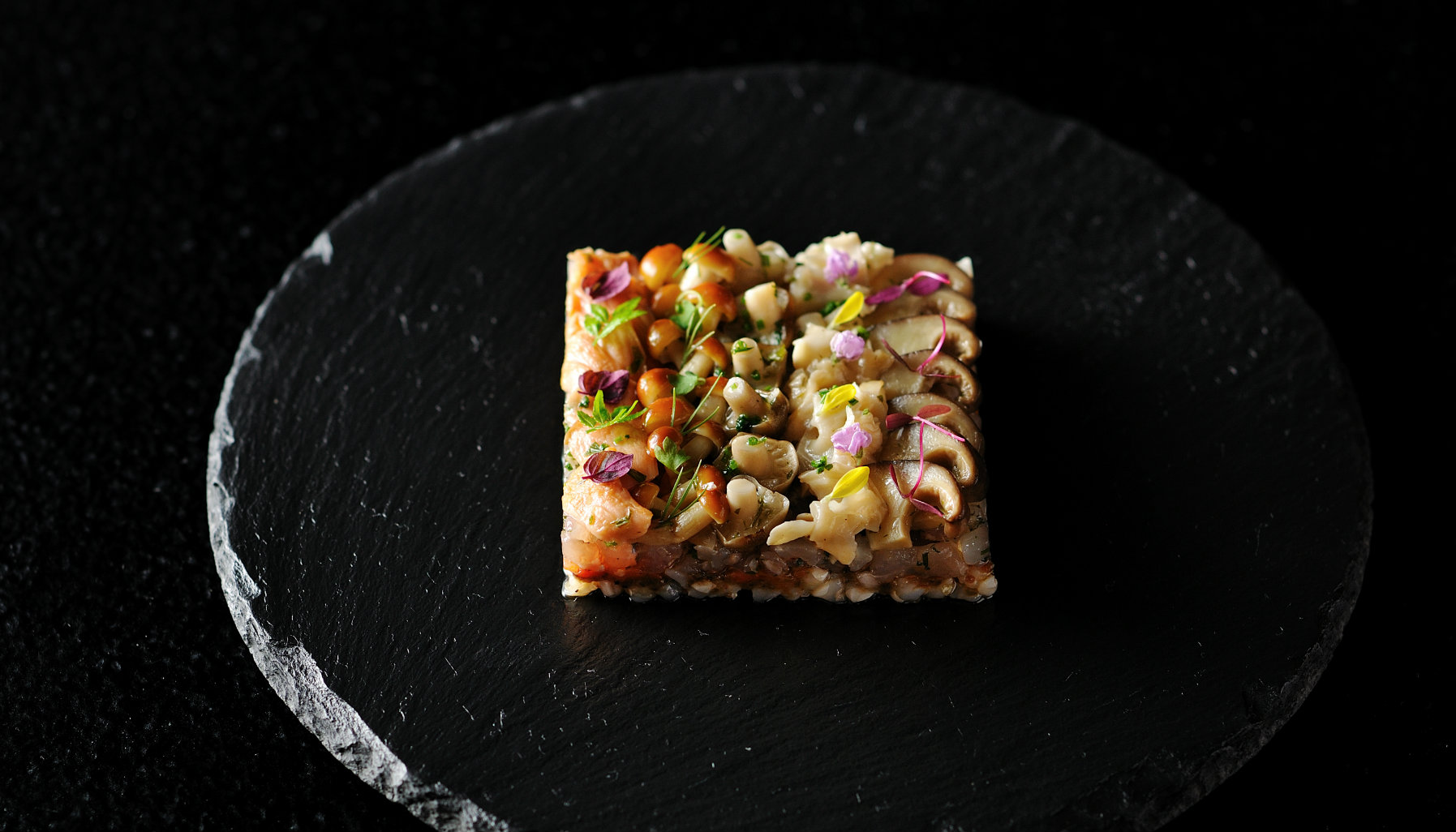 The display of skill and creativity continues with a course resembling a miniature cake, made with paper-thin apple slices encasing hairy crab filling and topped with micro edible flowers on a bed of powdered hairy crab roe. This was almost too beautiful to eat — as was the horse mackerel tartare layered with tart tomato puree and chewy buckwheat grains, finished with five types of tiny wild mushrooms.