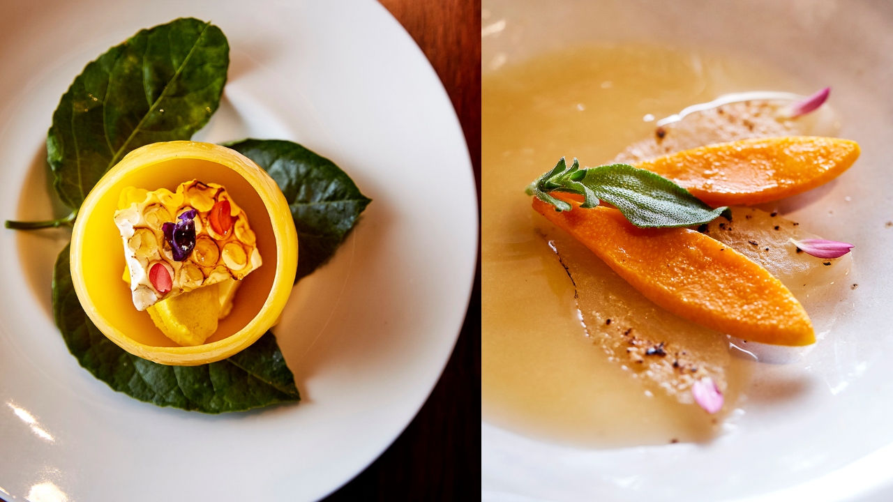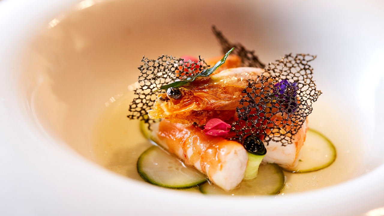 To start, a duo of amuse bouche are presented featuring bites of homemade brioche with delicate slivers of walnut and edible flowers, and a glistening mouthful of walnut cream topped with tropical caviar. These concise bites set the tone for the visually appealing courses to follow—beginning with a dish comprises braised daikon and pumpkin finished tableside. As the poetically arranged root vegetable “petals” are gently submerged in translucent miso dashi broth, the ritual is as soothing to watch as it is to savour. The prawn course came next, with its avant-garde plating symbolising Koh’s aspirations of zero waste on a dish. “We use every part of the prawn, even the shell which is boiled, deep friend, baked and dehydrated to make it palatable. This is finished with the prawn head stuffed with a curry and dried shrimp filling,” Koh enthuses.