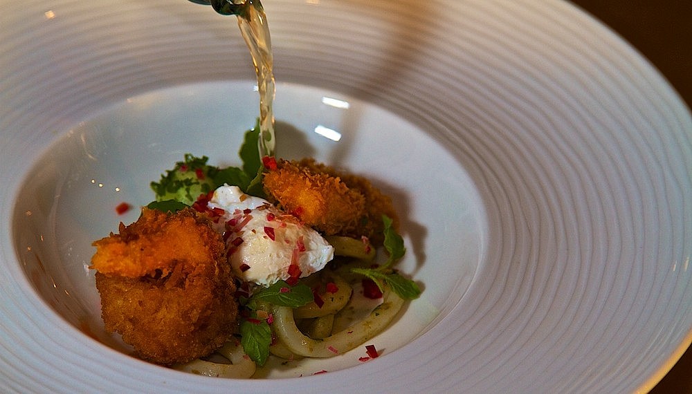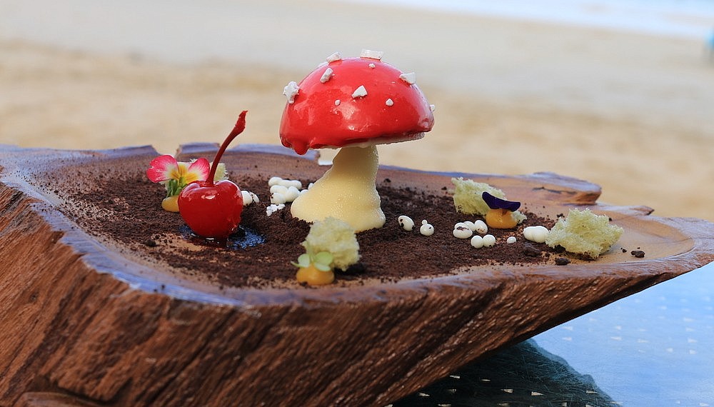 One might think the seafood theme stops at dessert; but one would be wrong. The Black Rainforest cake takes the form of a toadstool mushroom growing out of a forest floor of chocolate powder, but most impressive is the signature Strawberry Reef – a hurricane of flavours (including candied seaweed) that pays tribute to the corals slowly regrowing mere steps away from where your dinner is ending.