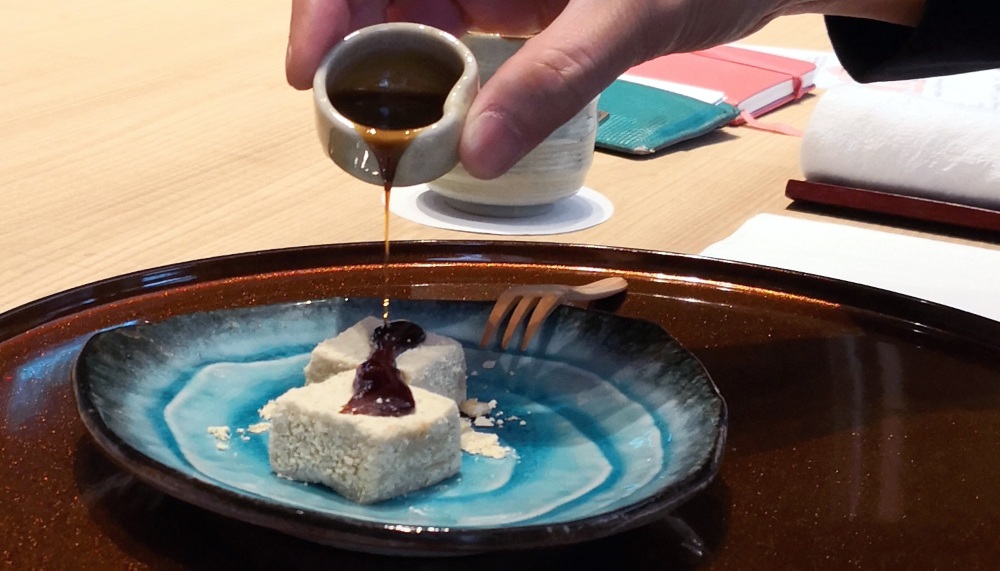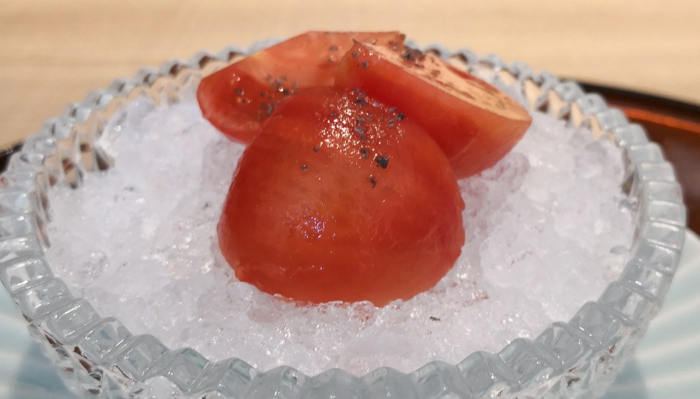 The result is similar to a bespoke suit or a custom-made shoe, in the sense that every course – be it sashimi, tempura, or dessert – is sourced, created, and cooked with you in mind, right in front of you. It goes without saying that you’re offered the best of the seasonal ingredients available, too: for the appetiser, sharp Japanese steel parts plump, sweet Amera tomatoes, which are served with a delicate sprinkling of black salt. The soup that follows is a clear, pure broth of Spring sea bream with slivers of yuzu floating within it.