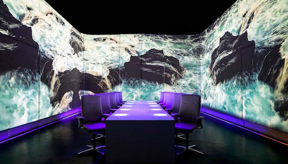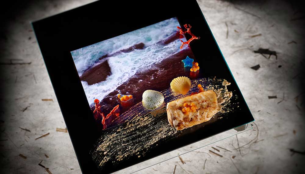 Two different lobster dishes are served: lobster poached in sea water is accompanied by projections of fierce waves and crashing sounds to recreate the scene of fishermen cooking at sea, whilst a grilled lobster dish is joined by calm images of a beach in Bali.