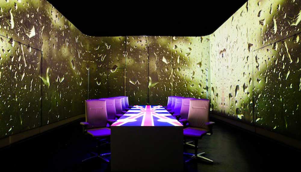 There’s plenty of humour too. Fish and chips encapsulated in an over-sized battered caper filled with anchovy tartar is served with huge rain drops lighting up the walls and the drumming of the rain. A Union Jack appears to drape the table and The Beatles’ Obladi-oblada plays.