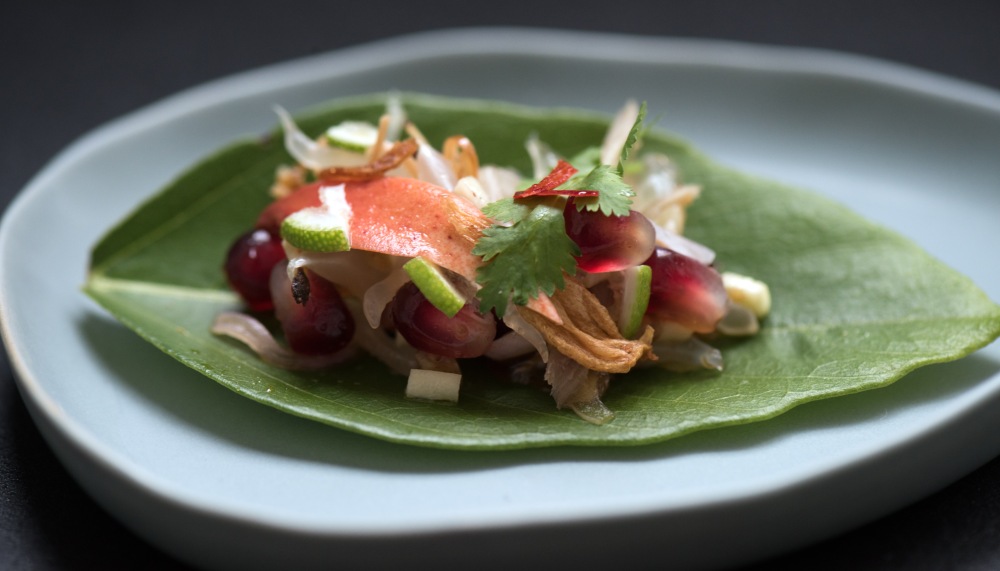 Chef Pim Techamuanvivit, a food writer (her former blog Chez Pim had a following of both insider American chefs and ardent Thai food fans) and owner of the one Michelin star Kin Khao in San Francisco, takes Nahm on a maternal spin through Thailand’s bucolic farm country. A keen supporter of local food producers, she revolves her menu on home-grown crowd-pleasers like banana blossom petals served with seasoned crispy fish; miang of lobster, chicken, green mango and snake fruit; wagyu herb soup; and lamb massaman curry with lychees, tender potatoes, and crispy shallots.