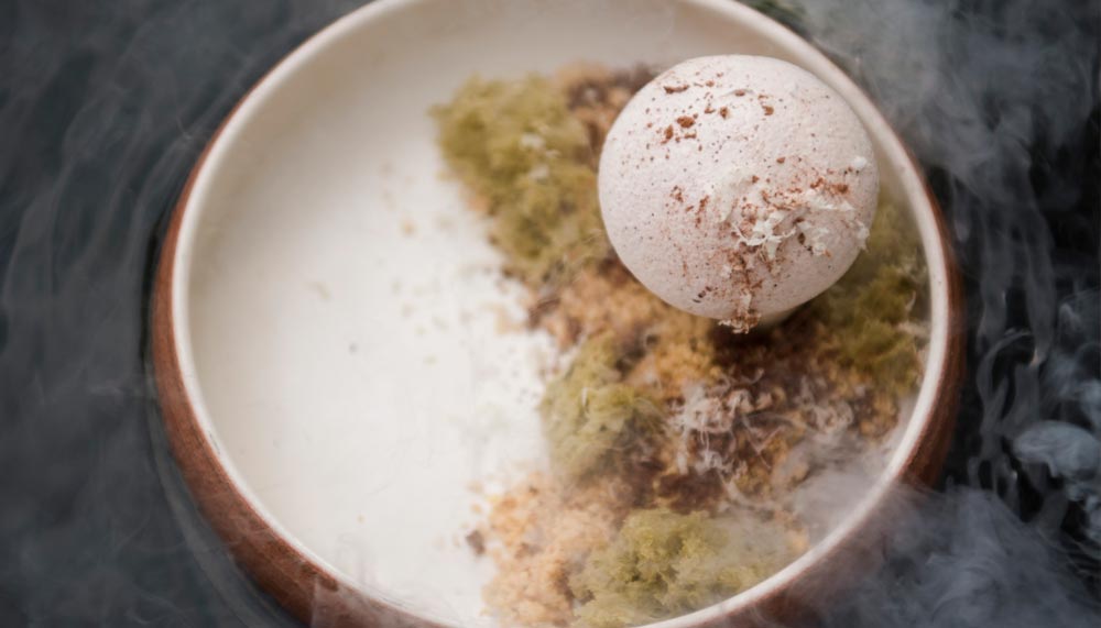 And so, traditional sate lilit, spiced minced meat wrapped around a stick of lemongrass before grilling, is deconstructed into a mix of fresh raw mahimahi bought from the Jimbaran fish market and brimming with the fragrance of fried shallots, coconut yogurt and basil ice cream. A stick of lemongrass straddles the plate, waiting to be chewed on for the final flourish in taste. A carrot and tumeric juice is savoured amid fragrant swirls as hot water is poured into a bowlful of lemongrass, Kaffir lime leaf and tangerine mixed with dry ice, evoking the herbal smells of the Kintamani highlands.