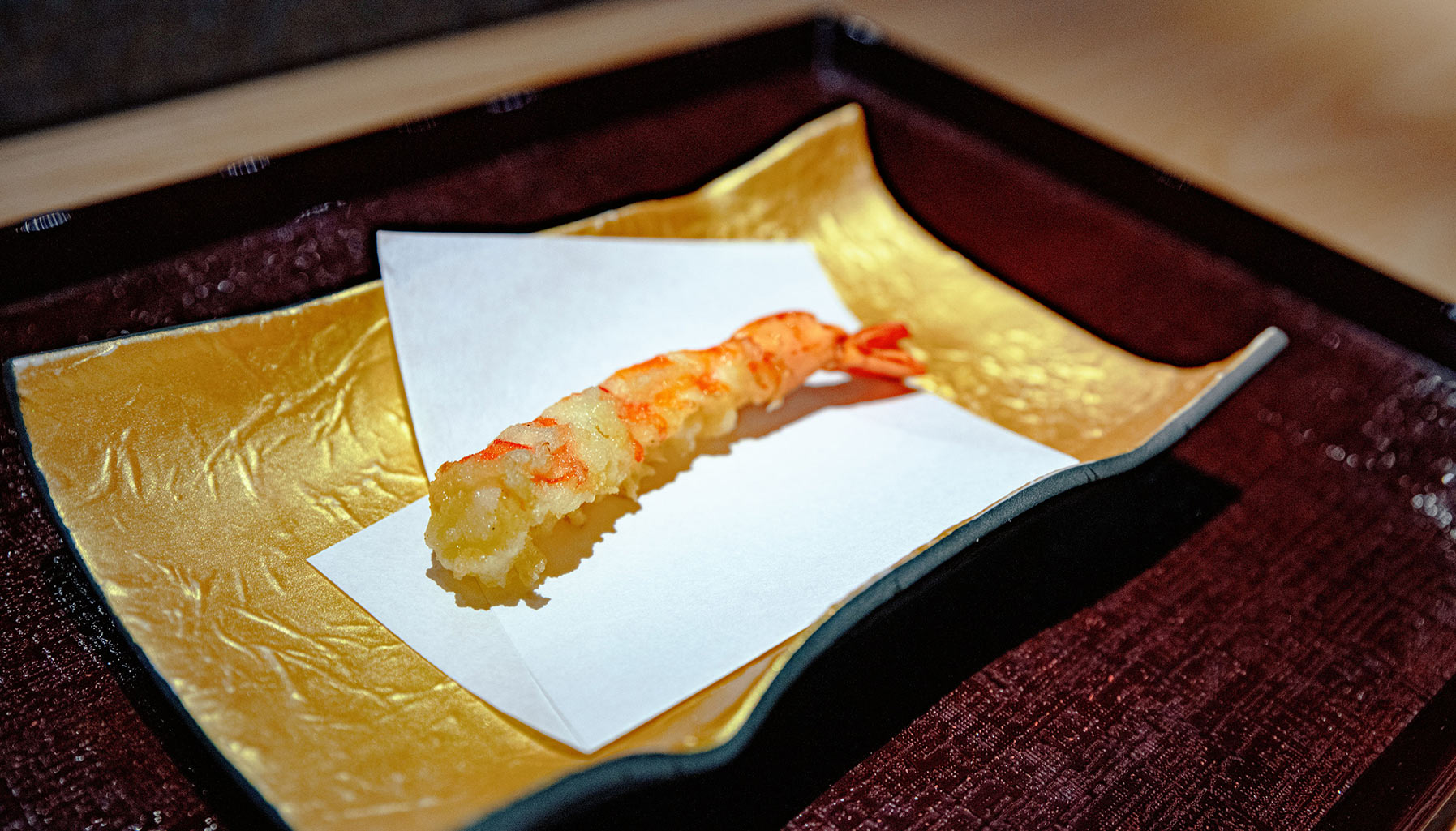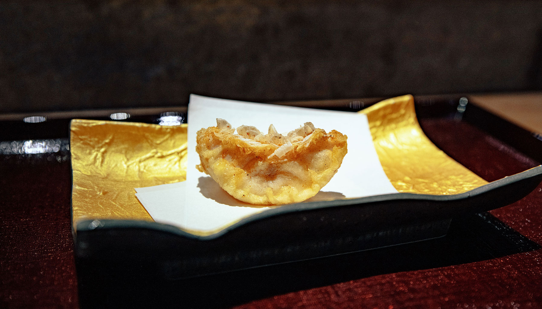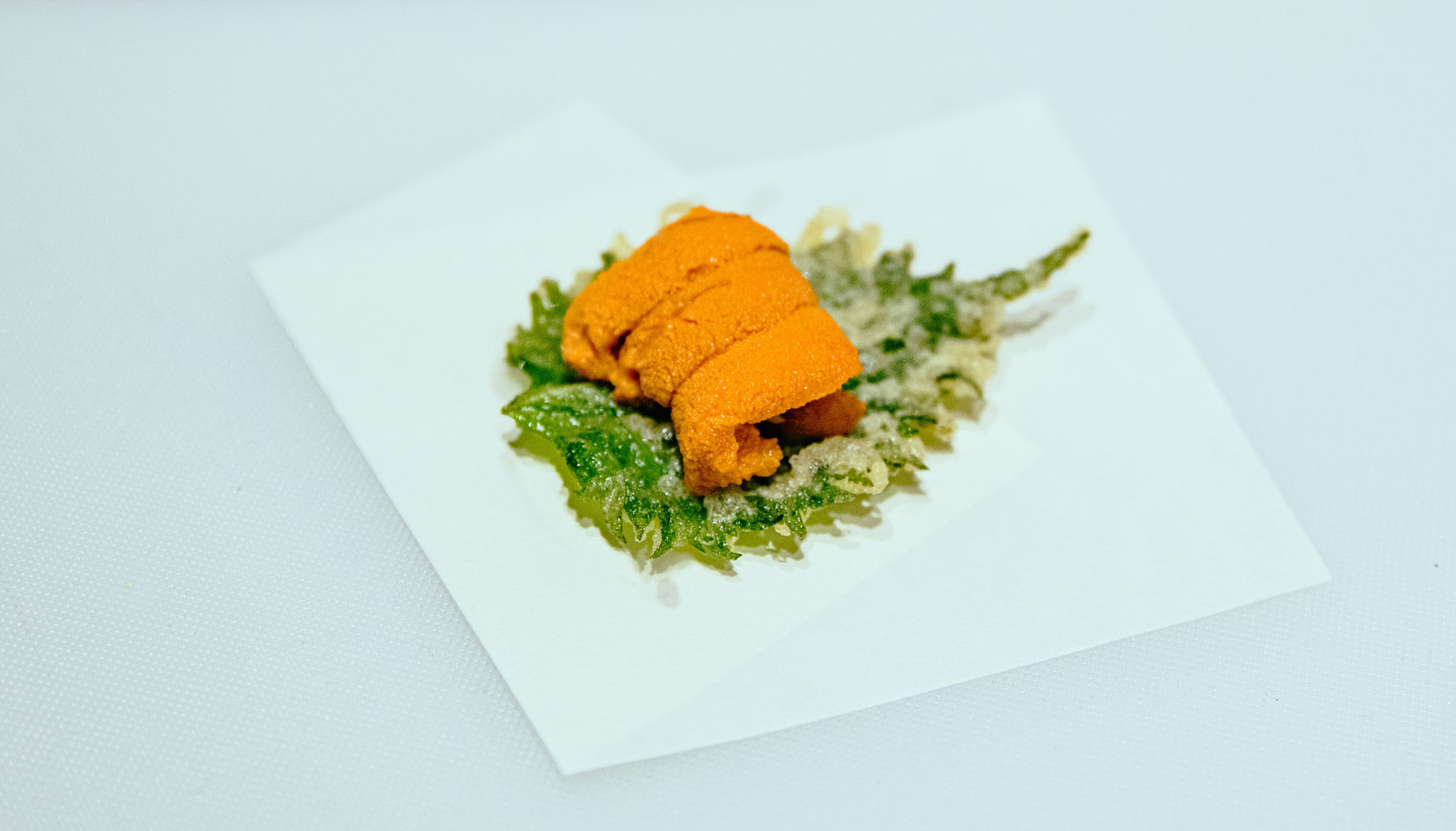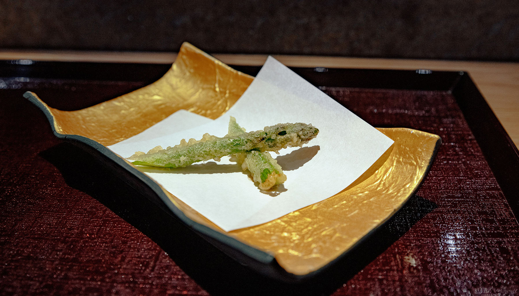 To say that Tenmasa’s tempura is traditional Edomae may be inaccurate, as Iwaasa classifies his cooking style as new-traditional tempura due to the use of rice bran oil instead of the classic sesame oil. Furthermore, where Edomae tempura tends to favour seafood and vegetables available during Japan’s Edo period, Iwaasa builds on this foundation with dishes like sukiyaki style wagyu and foie gras tempura. “I want people to know that tempura can be healthy for the body,” Iwaasa clarifies.