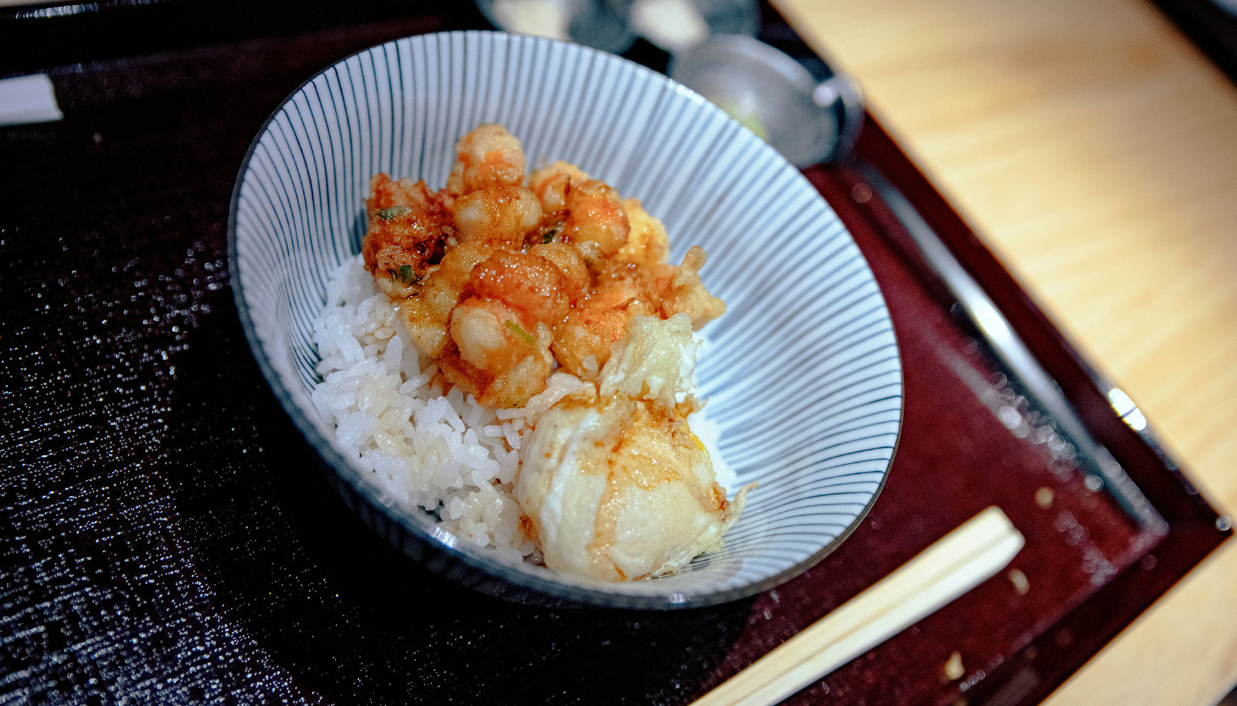 Diners can opt to have their kakiage either on its own with rice and egg, with a little sweet sauce or chazuke style with green tea, completed by a side of miso soup and pickles. For dessert, a tart and refreshing yuzu monaka and Tochigi strawberry ends the meal on a high note.