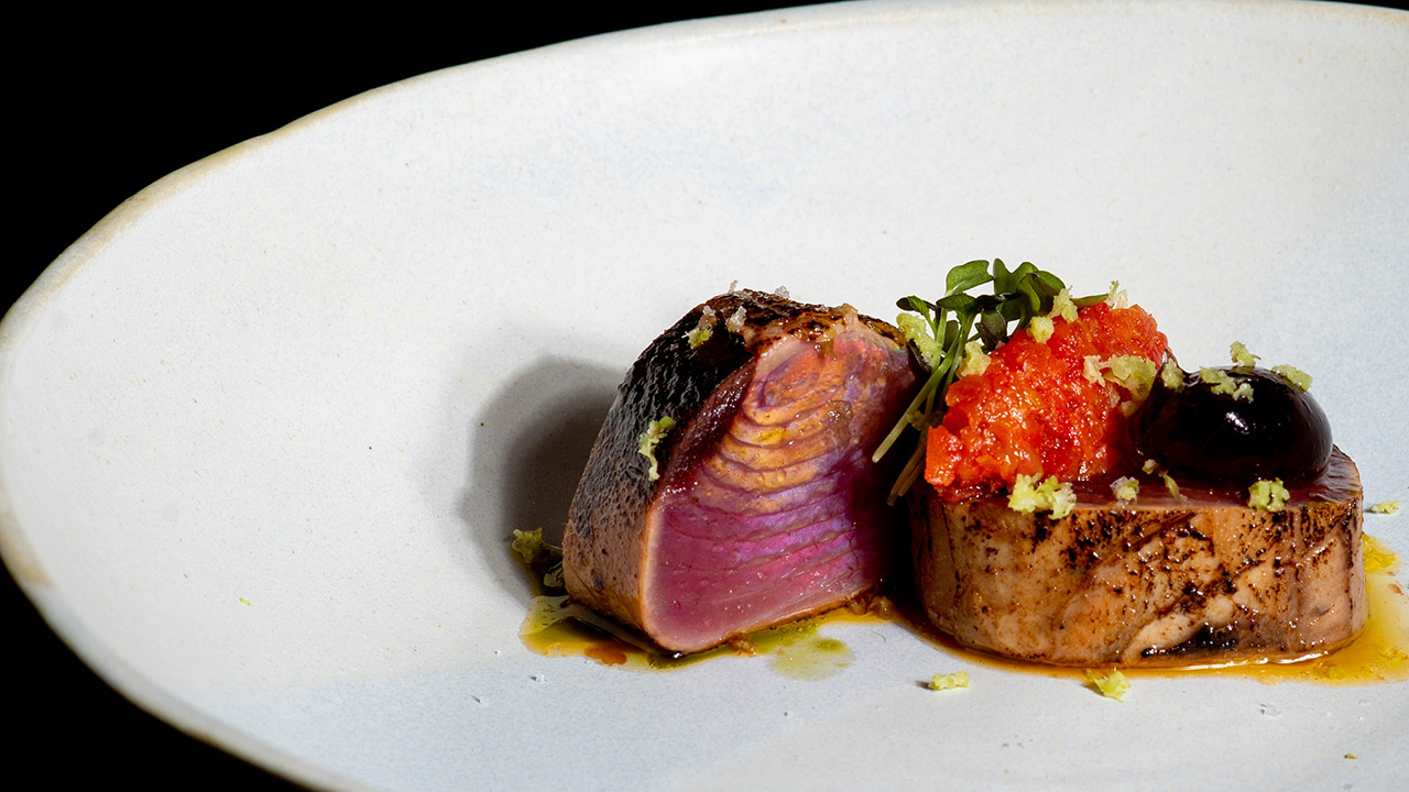 Next, diners choose between bonito – lightly seared with soy jelly and fresh wasabi before drilled with tomato and tea oil – or a medley of surf clam, whelk and geoduck – also lightly seared in a crustacean-butter emulsion. The former is cooked in a style reminiscent of tataki, where sashimi is broiled at the top for greater flavour, leaving the inside of the meat still raw and tender but searing its top and bottom to lock in its natural flavours. The dish’s lighter profile matches well with a glass of bianco, chosen for its freshness and palate cleansing qualities. The latter is pure flavour decadence, with sweetness and rich umami of the shellfish enriched by a rich garlic butter sauce that ticks all the right boxes, one complemented by the sweetness of a rosé.