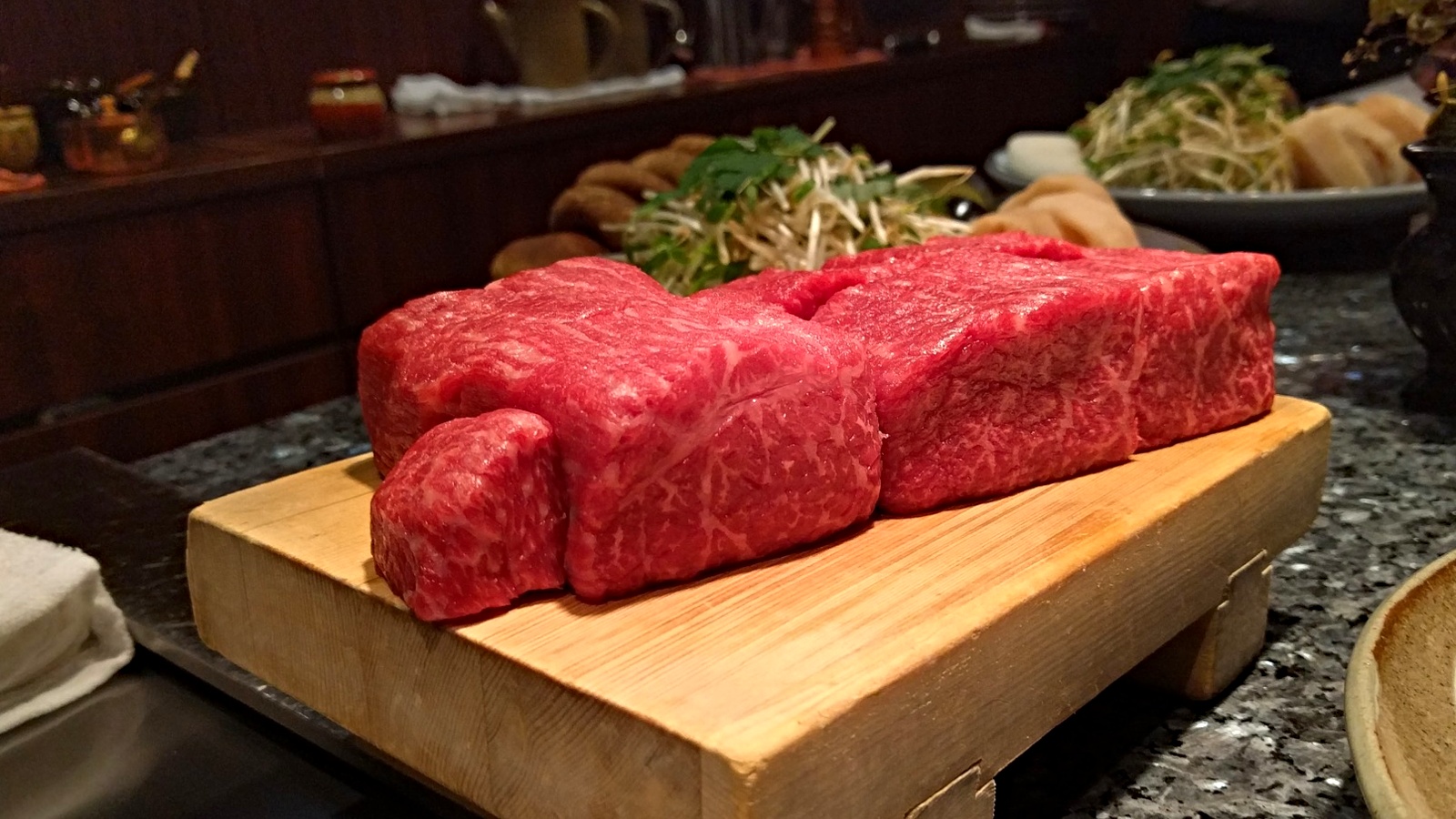 Japan’s Meat Grading Association grades each wagyu carcass based on its yield from A thru C as well as its marbling, colour, firmness and quality from 1 to 5, making A5 the highest possible score. Some countries, however, breed their own non pure-blood wagyu, at varying degrees of authenticity and quality. American wagyu, while delicious, since it is usually cross-bred with angus cattle, it will produce a different marbling pattern, as you can see in the picture above, where the American wagyu on top isn’t as rich as the A5 wagyu on the bottom. And if you see ‘wagyu meatballs’ on a menu, for example, you can be highly confident that it’s not the luxury version you normally associate with the term.