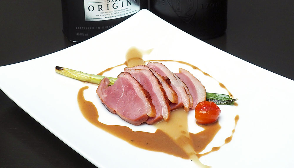 The richer, deeper Highland Park Dark Origin – the result of using twice as many first-fill sherry casks than the Highland Park 12 Year Old – was partnered with another entrée of charcoal-grilled smoked duck breast. The expression’s notes of toasted hazelnuts, ripe bananas, sherried spice, and warm dark chocolate brought out the subtle sweetness of the dish’s caramelised spring onions and apple puree, but retained its well balanced, harmonised flavours.