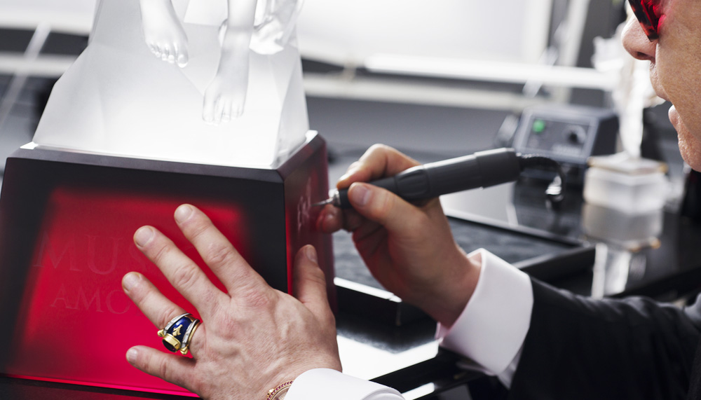 Indeed, Elton John and Lalique first began working on the pieces two years ago – they had worked together on a number of less show-stopping, cherubic pieces in 1997, also for Elton John AIDS Foundation, and clearly wanted to top those. This is why, while the limited edition pieces were made using an iron mould – allowing for multiples to be produced – the auctioned pieces were made using the more precarious lost wax mould technique, by which a wax model is carved, coated in plaster, heated to allow the wax to melt away and the plaster to harden, leaving a one-use mould into which to pour the glass.