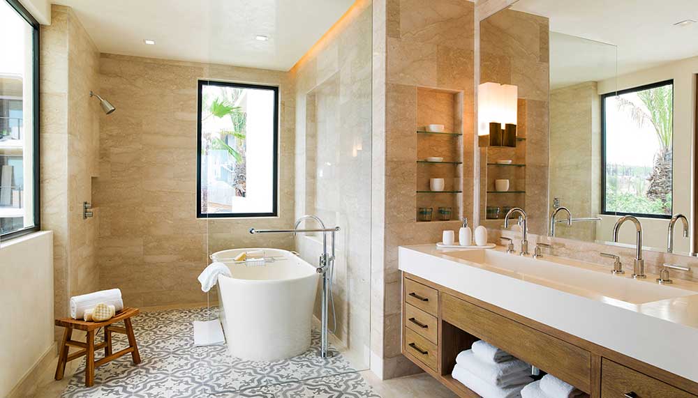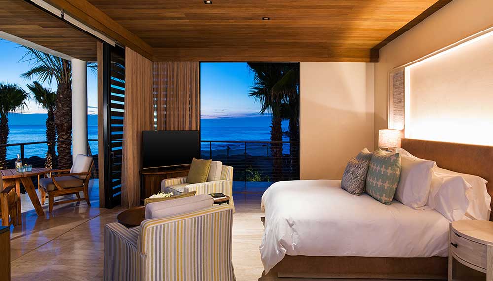 A jaw-dropping open-air passageway with unobstructed views of Chileno Bay and the surrounding landscape politely receives guests upon their arrival; there’s even a freshly-crafted Chilenito cocktail provided in the room. When not lounging in a private cabana by the 150m three-tiered pool, guests are encouraged to jump on the plethora of adventures offered through the H2O Watersports Activity Cave. Known for the best snorkelling in Los Cabos, the serene waters of Chileno Bay are ideal for watersports like water cycling on Schiller S1 bikes, stand-up paddle boarding in the evening, and journeying off in a glass-bottomed kayak.