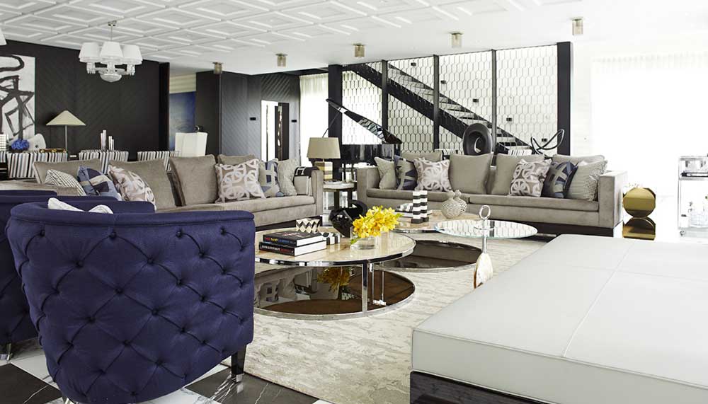 In the formal living space, an expansive wool-and-silk rug lies beneath two sizable onyx-and-chrome coffee tables from Minotti that help to anchor the large room. Ample grey Minotti sofas, as well as navy armchairs from Fendi Casa, define the seating area.