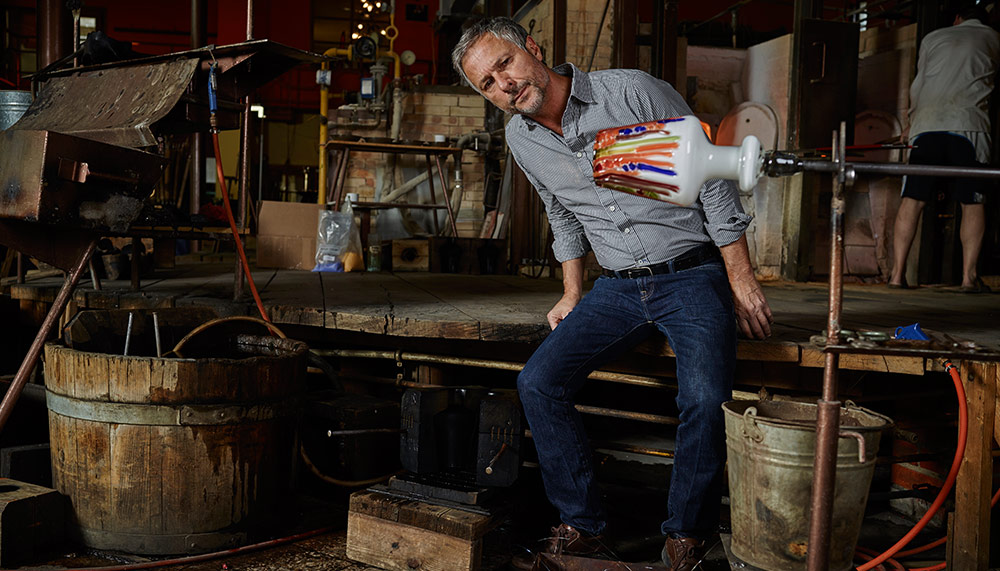 We were sitting under the Fungo chandelier – a singular, striking piece comprising of rigid wood and irregular blown-glass. With a twinkle in his eye, Campana confessed that it was his first time setting eyes on the chandelier since it’s inception. Surprised but pleased with how large it turned out, he revealed that its creation was pure happenstance. On his second visit to the Lasvit factory, he had gone down to the humid basement where the ancient wooden glass-blowing moulds were stored. The odd shaped fungus he noticed growing on them sparked his imagination, and 30 minutes before flying back to Brazil, he convinced the art director to challenge his artisan’s glass-making techniques into making the amorphous shapes that seemed to bloom organically out of the chandelier’s wooden frame.