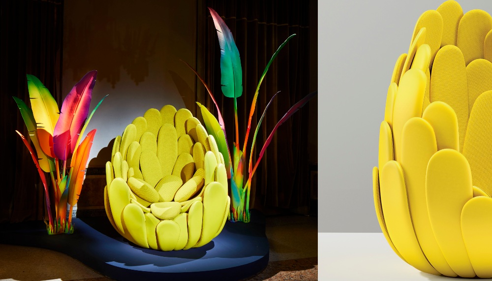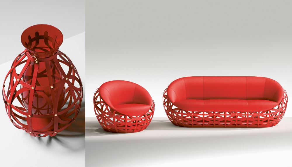 From the blinding sunlight, visitors ascend an ornate circular staircase moodily lit by the first of the new Objets of this year, a cluster of Diamond Vases, made of red, handblown Murano glass suspended in leather straps designed by frequent collaborator Dutch super designer Marcel Wanders. Sexy and captivating, the lighting set the tone for drama awaiting at the top of the stairs. Another alumni collaborator, the Campana brothers, were given the honour of creating the first tableau, a tropical fever dream of vividly coloured chairs called Bulbo. These cozy seats transport the sitter in a cocoon-like pod of leather and soft fabric, impeccably crafted.
