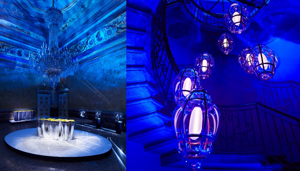 Moving on to the larger hall, the remainder of the eight Objets awaited from Atelier Oï’s Serpentine dining table featuring foldable criss-crossed legs woven interwoven with finely worked straps of blue Louis Vuitton leather to Raw Edges’ Dolls chairs which are as whimsical as they are customisable. The rest of Wanders’ new Objets could be found with the beguiling pair of Diamond Sofa and Armchair with their bases of intertwined ash and rich leather upholstery and Venezia, a lamp inspired by traditional Venetian lanterns. India Mahdavi brought her lacquered Talisman tray, with its “benevolent eye” design, while Tokujin Yoshioka presented the Monogram pattern-inspired Blossom Vase, made of heavy, handcrafted Murano glass.