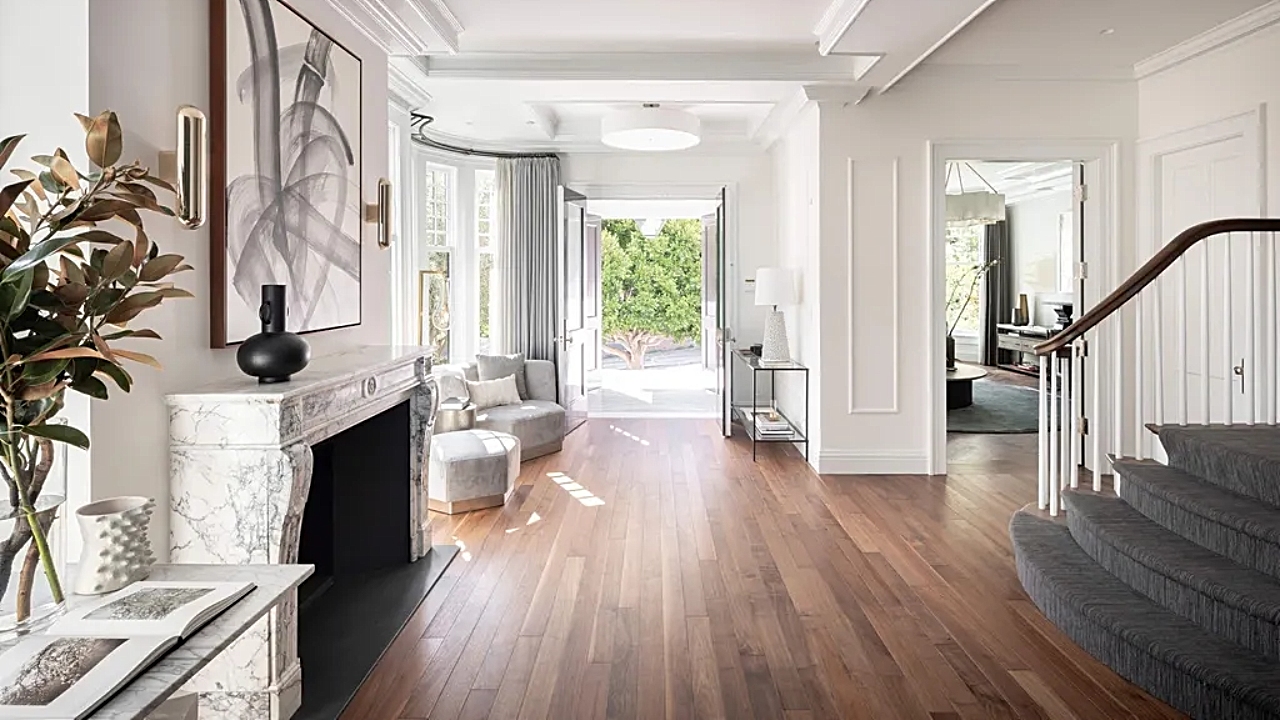 Marble steps from the Pacific Avenue sidewalk take you into a grand foyer that flows into a cozy living room with its inviting fireplace and gorgeous angle-planked walnut flooring.
