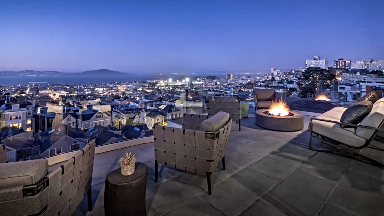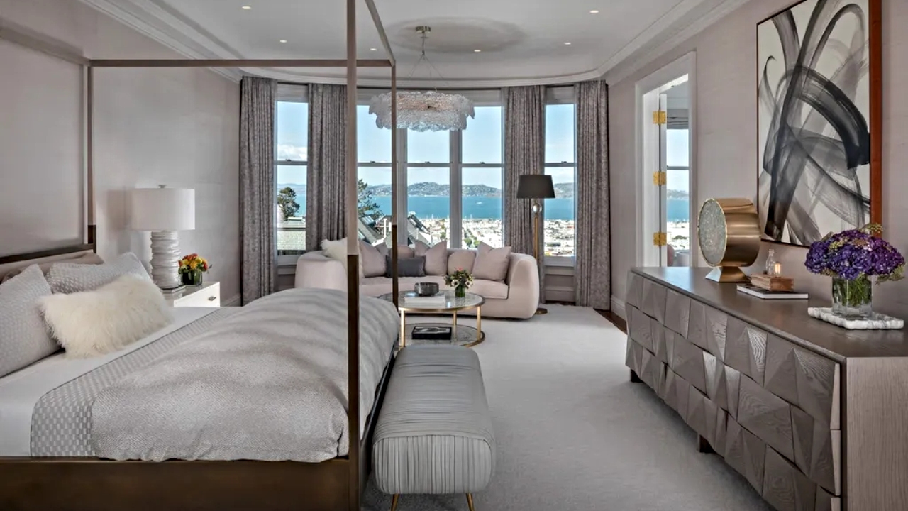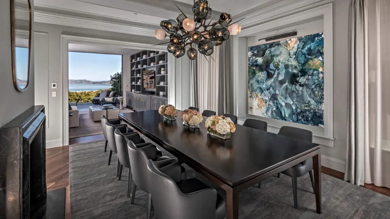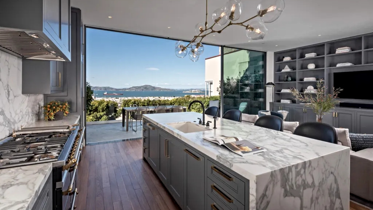 Stroll past the grand, skylight-lit staircase and you enter a formal dining room and the home’s open living room and kitchen. Here a wall of glass provides jaw-descending views of the San Francisco Bay, Alcatraz and Marin County in the distance, along with access to a large patio.