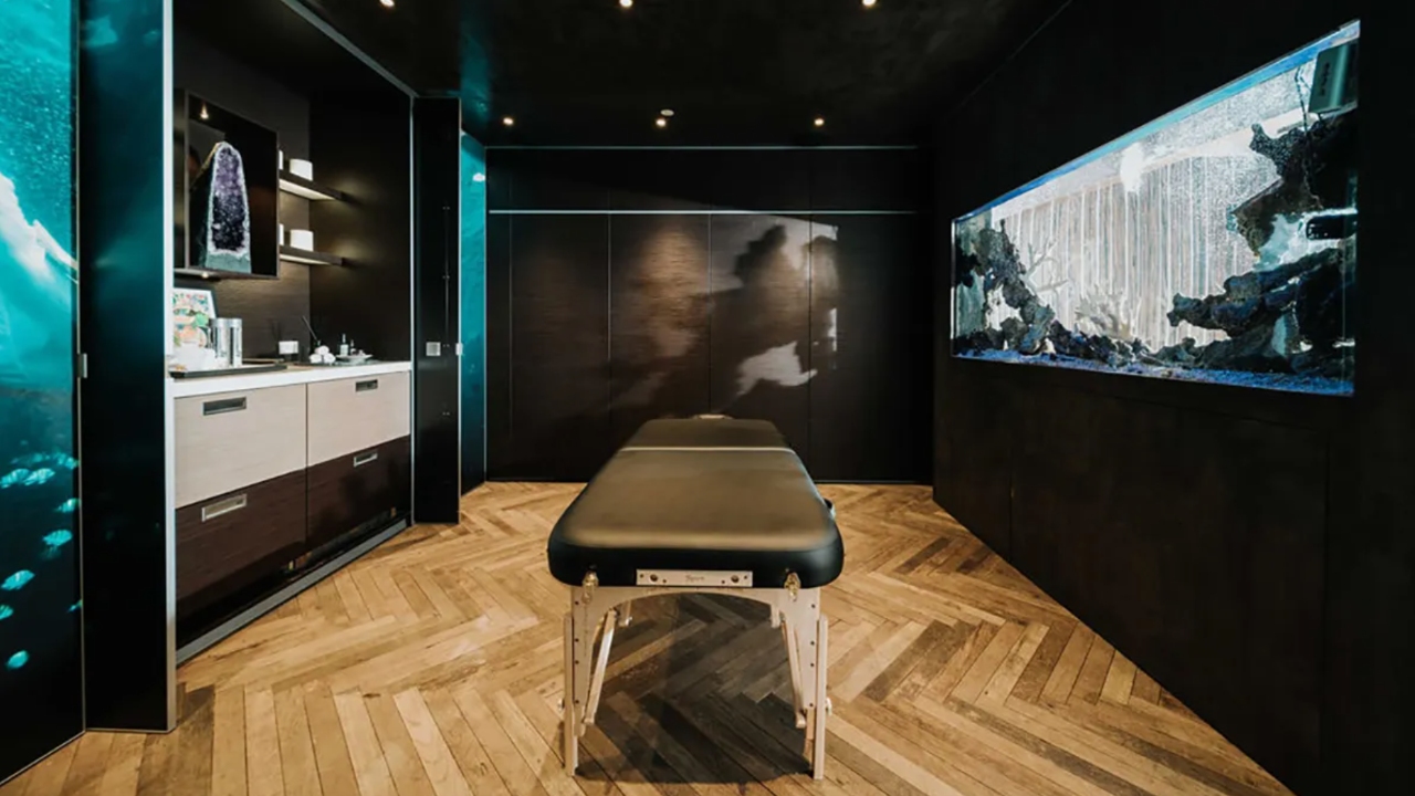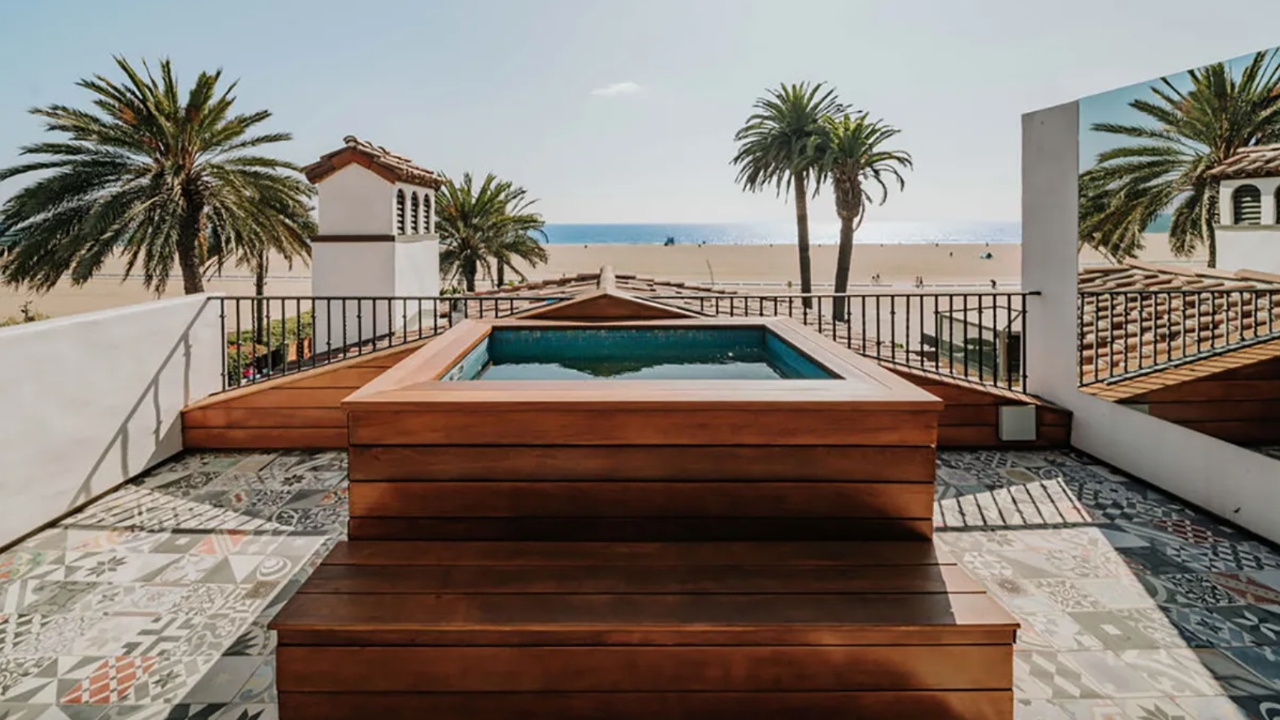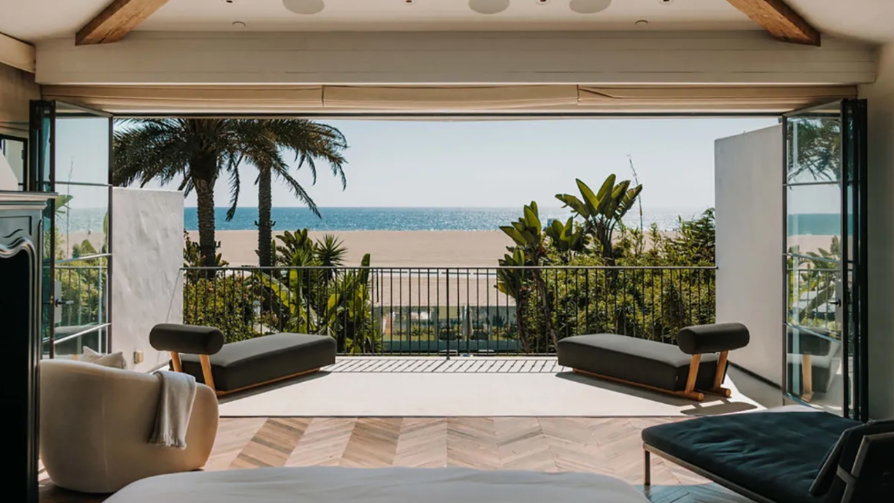 Described in marketing materials as “second to none,” the three-story residence is sited on the exclusive Palisades Beach Road, which is often referred to as the “original Billionaire’s Beach.” Protected by a high-tech security system, the property features five bedrooms and eight baths in a little more than 6,600 square feet of fully furnished living space boasting antique parquet and chevron-patterned oak floors, exposed brick walls, semi-precious stone accents, custom light fixtures, and walls of glass overlooking the Pacific.