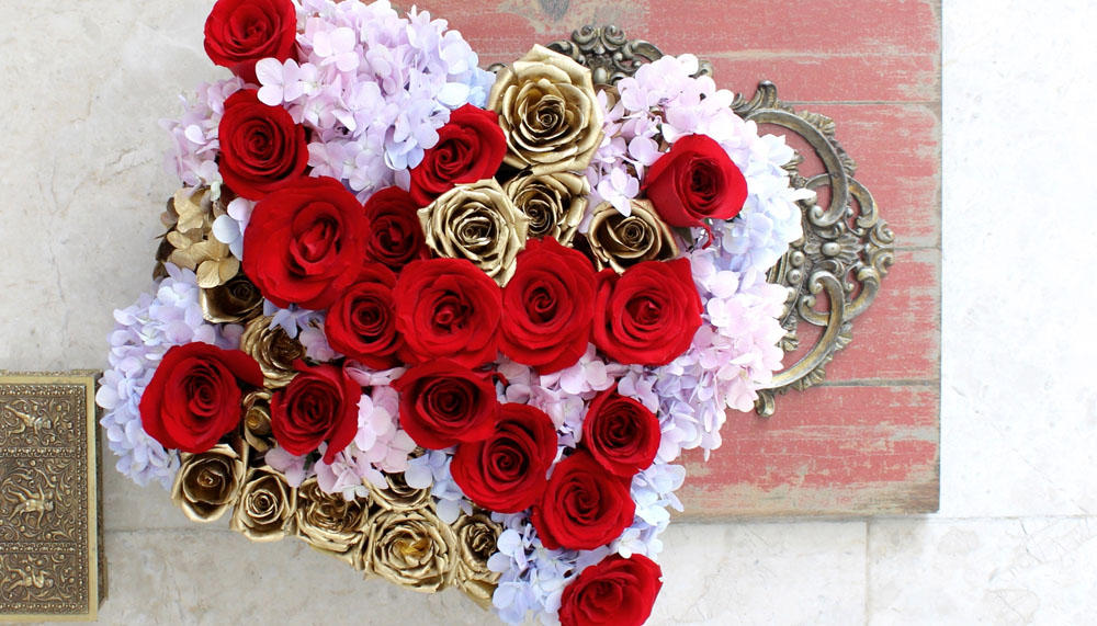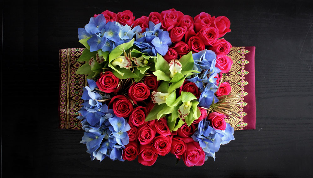 Like the Alexandra (RM 525), from its catalogue, a vibrant canvas of red and fuchsia roses, accented with pixels of bright blue hydrangeas. This element of contrast is something Maison des Roses does well; utilising chroma combinations to their best effect. In the Czarina bouquet (RM525), Taj Mahal red roses stand out brilliantly against a pastel pink and blue background of hydrangeas, with hand-painted gold roses providing additional Slavic drama. The Saloma (RM575), inspired by the palette of the Peranakan culture, splashily weaves the three primary colours together – the red of roses, the blue of hydrangeas and the green of cymbidium orchids.