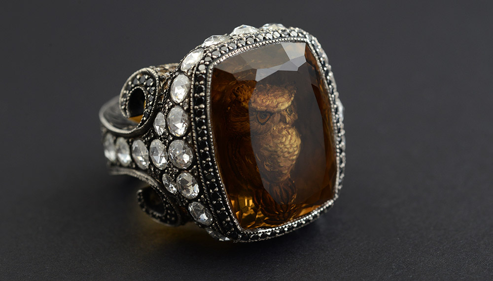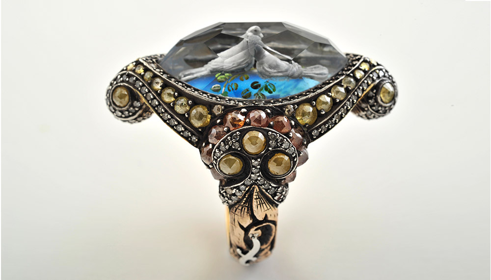 Choosing the path less taken has certainly paid off. The accomplished artisan has received the prestigious Couture Design Awards six times and could even afford to take himself out of the running to make room for younger designers. The inverse itaglio carving technique he’s revered for is a result of the experimental designer’s penchant for boundary-pushing. Unsatisfied with the “blankness” of gemstones, he decided to carve various renowned Turkish monuments into the center of the stones. He refined the technique which each piece, carving deeper and deeper. Each experiment led to new discoveries, such as “inverse layer painting”. The technique, used to depict migratory birds such as seagulls flying over the majestic buildings of Istanbul, lent unusual depth to the intaglio carvings, making the world within the precious gems even more realistic.