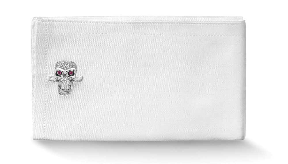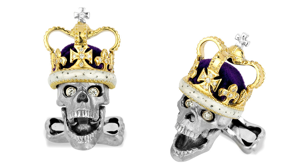 From one of the best-loved makers of cufflinks in the world is this: an unusually macabre yet quintessentially cool pair. Shaped as twin skulls, the white gold cufflinks are set with pave diamonds, accented with ruby eyes. In keeping with the brand’s love for mechanical elements, the jaws of the skull are capable of move, masticating slightly as wrists jostle.