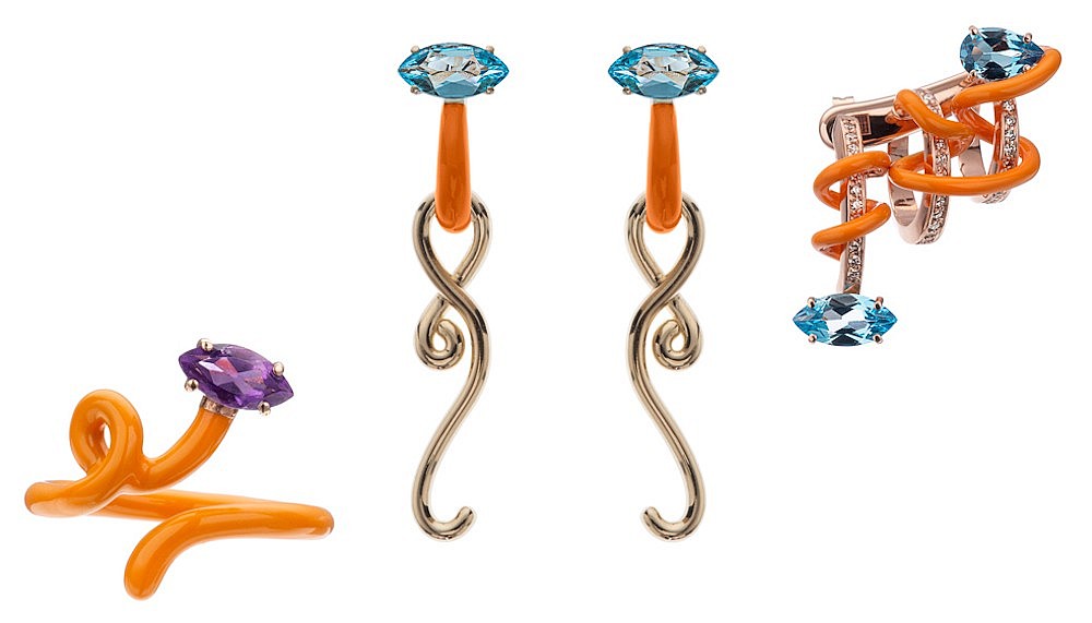 “I wanted to keep exploring enamel as a medium, but there are some limitations to its uses, so I chose to create these Vine Wrapped pieces that use gold vines instead of enameled ones,” Bongiasca explains. “In this manner, I did not have to limit my creativity to using enamel, and I could transmit the fluidity and curves of the collection to the metal part of the piece.”