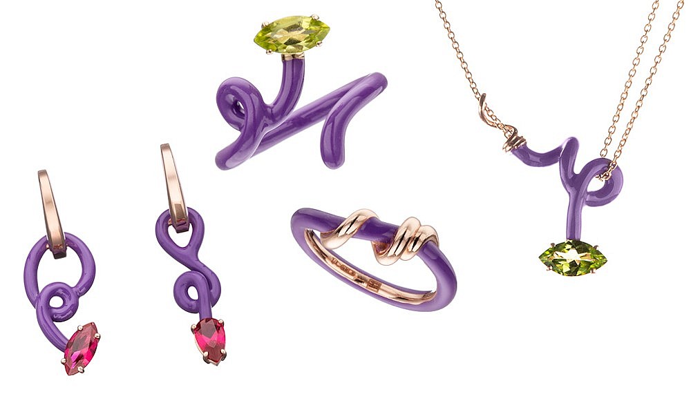 Bongiasca describes the new designs (from US$490 to US$2,030/RM1,865 to RM18,660) as toeing the line between (slightly) more subtle, wearable pieces and more traditional high-brow jewellery. Each piece incorporates bold pops of colour, from a rose gold and silver necklace with a green enameled vine and drop-cut amethyst to eye-catching asymmetrical vine baby hoops in 9-karat rose gold and silver with orchid enamel, marquise, and drop-cut corundums.