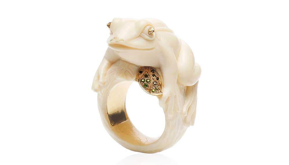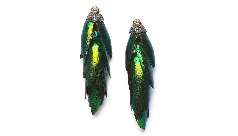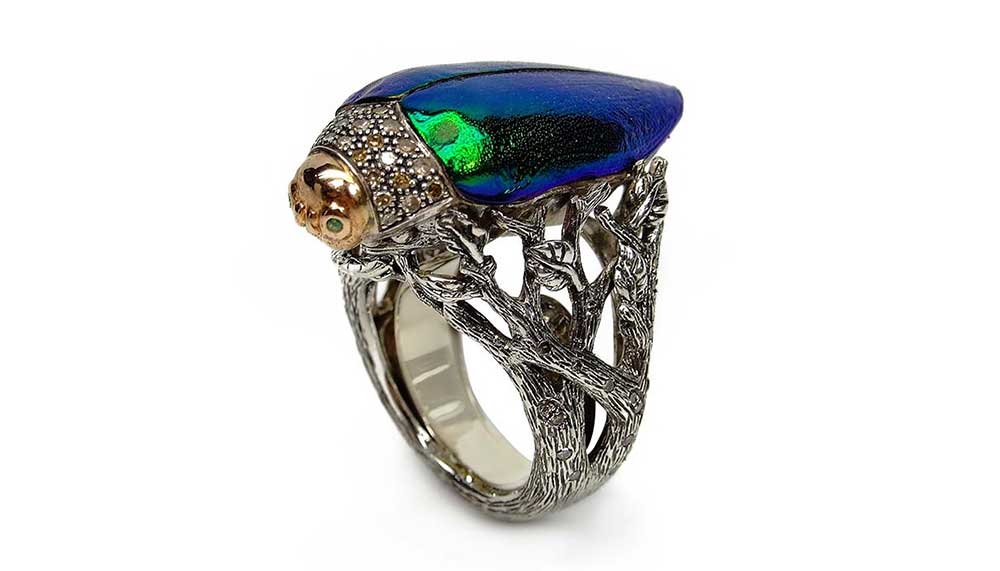 For Bibi van der Velden, jewellery clearly is much more than just precious metals and gemstones. During her frequent travels, the innovative sculptor and jeweller searches for the unlikely elements that define her imaginative pieces. Take, for instance, the collection that she recently created using the wing cases of scarab beetles. “The natural iridescence and colours of the wings could never be re-created outside of nature,” says van der Velden. She cast the delicate sheaths in gold or sterling silver and embellished the pieces – rings, necklaces, earrings – with a sprinkling of colourful gemstones.