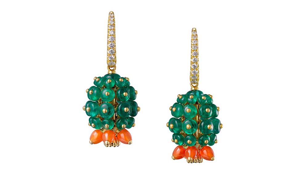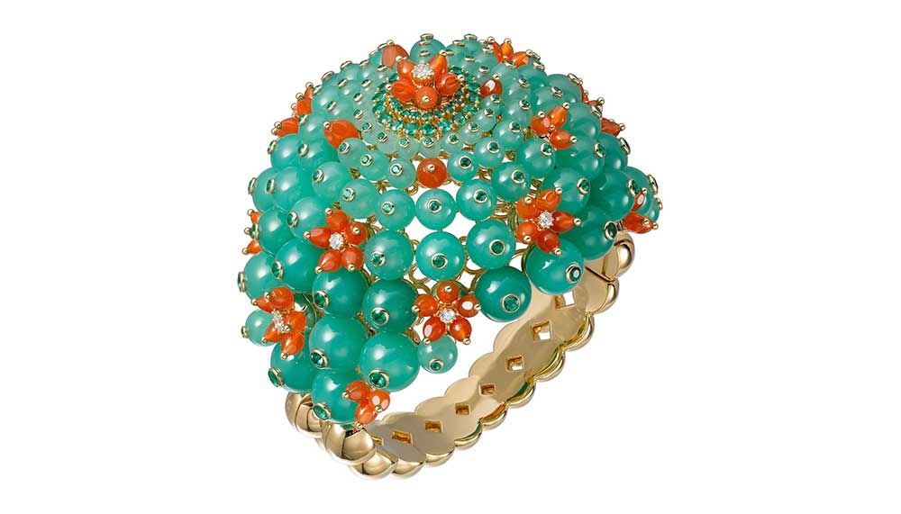 Bold, bright and colourful, Cactus de Cartier is a collection of rings, earrings, bracelets and necklaces that depict the cactus in playful, bulbous forms. Using chrysoprases, emeralds, carnelians, lapis lazuli and brilliant-cut diamonds, it captures the vivid shades of the spiky plants that dot the deserts. In squat, spherical shapes, beads of green chrysoprasea and emeralds are punctuated by brilliant red bulbs of carnelian, representing the cactus in full bloom, which only happens at night – which is an appropriate metaphor. Elsewhere, gold beads set with tiny diamond and emerald flowers capture the cactus at daybreak, still glistening with dew as it closes up at the sun’s rise.