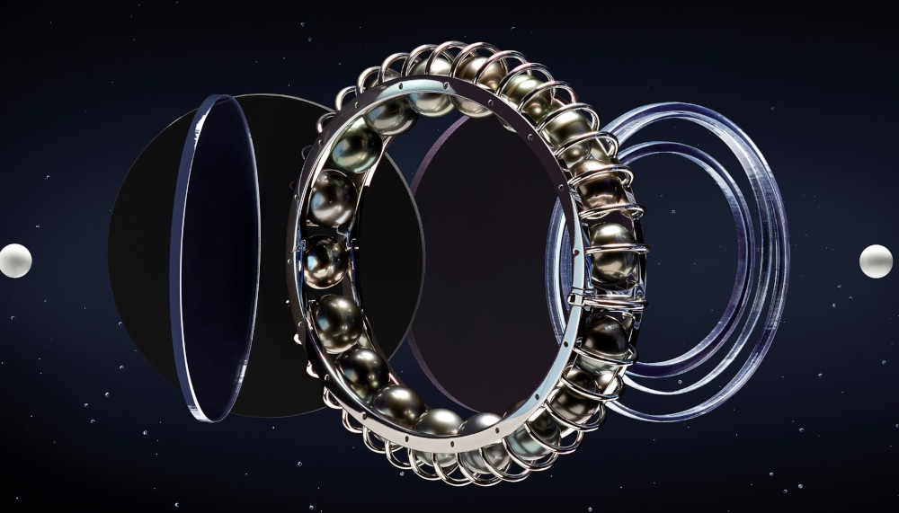 Each piece in the collection (which ranges between EUR12,000 – EUR205,000 or RM55,095 – RM941,216) builds on new materials and allows its wearer to experience unprecedented visual, tactile, and sound sensations. Tahitian pearls roll across skin, fiery opals and blue sapphires emit quivering light, and mobile diamonds shift in Cartier’s serti vibrant, or trembling setting. The star of the show – a bracelet featuring an irregular mesh of square cones formed from pink gold, diamonds, moonstone, and milky quartz – infinitely diffracts light, reminding us of our origins from meteorites, asteroids, and stardust crystallised over several million years.