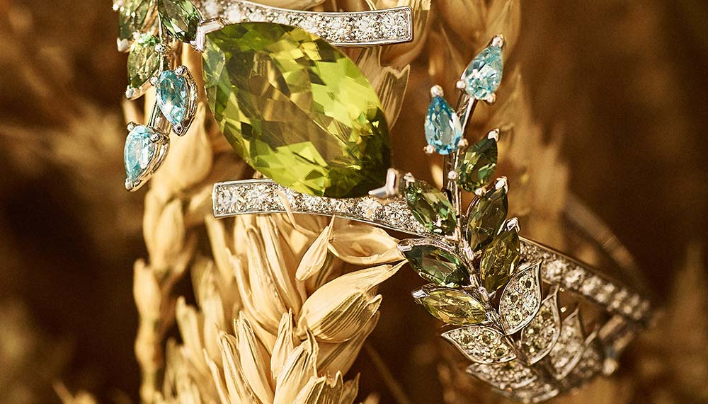 With Chance, the pieces resemble fresh sprigs of wheat in lush, verdant tones evoking springtime and the return of sunny days. Tender young wheat shoots are formed using diamonds, peridots, crystalline and aquamarines. Brimming with life, they appear to move along with the wind.