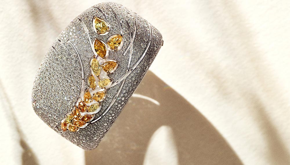 Happiness goes up close with colourful ears of wheat and the sun-burnished golden grains of late summer. Marquise- and pear-cut stones emulate the precious crop.