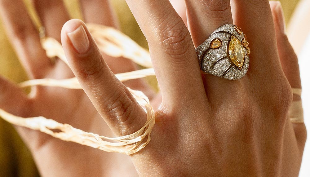 Prosperity takes us to summer and the harvest season where diamonds, yellow sapphires and pearls evoke vivid imagery of sun-kissed golden wheat fields. Here a stunning brooch in yellow gold and studded with precious stones draws reference to Mademoiselle Chanel’s painting by Dali: