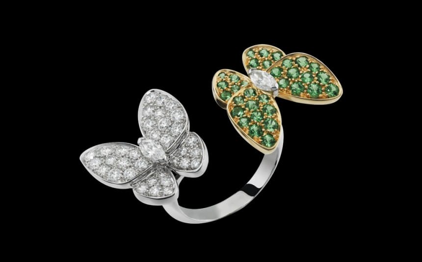 Perhaps the most significant collection centred around the butterfly is the Lacquered Butterfly collection unveiled in 2004, a collaborative effort with Japanese master lacquerer Junichi Hakose that resulted in beautifully handcrafted pieces. The creature is also featured in Two Butterfly, one of the maison’s anchoring collections, which debuted in 2001. This year, tsavorite garnets were introduced to the range, the cheery green injecting freshness to the winged motifs.