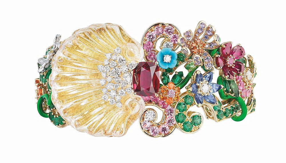 Each piece – there are 66 in all, 29 being unique – is a miniature encyclopaedia of botanic references. The Dior Bosquet de la Girandole asymmetrical earrings, for example, each contains a pulsating opal in the centre – glimmering liquid pools surrounded by delicate blooms. The Dior Bosquet de la Salle de Bal bracelet, on the other hand, is focused on a carved rock crystal shell, a direct reference to the Jardin’s Ballroom Grove.