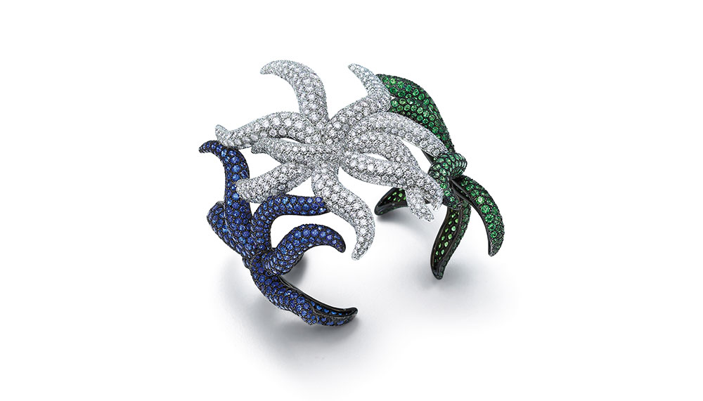 A sparkling trio of starfish in a cuff of diamonds, sapphires and tsavorites appear entwined in an underwater tango, their sinuous, outstretched arms waving gently in the current. A mind-bogglingly intricate bib necklace in platinum composed of over 3,000 round brilliant diamonds totalling over 200 carats drapes gently over the wearer’s decolletage, suggesting a softly shimmering sheath of stars rather than unyielding armour. An unexpected benefit of this design approach is comfort, not a word usually associated with high jewellery. Amfitheatrof says she’s made it a priority in her designs. “The woman of today has so many things to think about. The last thing you need to worry about is being uncomfortable.”