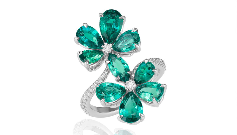 Pieces include stud or cluster earrings, single or You and Me rings, and a jewellery watch that’s set with pear-shaped and brilliant-cut diamonds and emeralds.